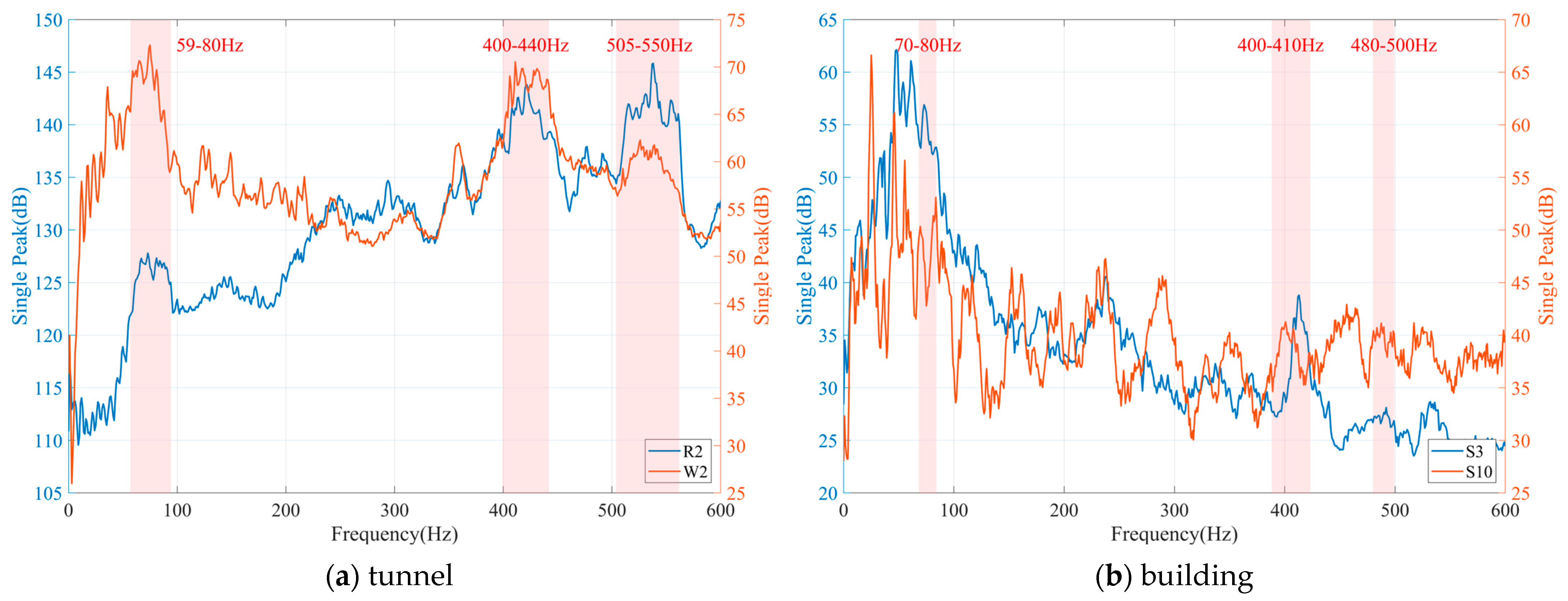 Figure 14a presents the single peak values of the rail and tunnel wall vibrations within the 0–600 Hz frequency range for each 1 Hz interval in the T2 section. It can be seen that the vibration excitation caused by rail corrugation prominently manifested on both the rail and the tunnel wall, with the tunnel wall vibration being dominant in the 59–80 Hz frequency band, forming a distinct vibrational energy peak. During the process of vibration transmission from the tunnel to the building, the high-frequency components (such as 395 Hz, 502 Hz, and 790 Hz) are greatly attenuated when reaching the building foundation due to the strong damping and dissipation characteristics of the soil, which has short wavelengths and is prone to scattering and material internal friction loss during propagation. In contrast, the low-frequency vibration (such as 80 Hz) has a longer wavelength and incurs less loss during propagation in the soil, thus being more effectively transmitted to the building structure. However, the building’s own structural dynamic characteristics act to filter and reshape the incoming vibrations.