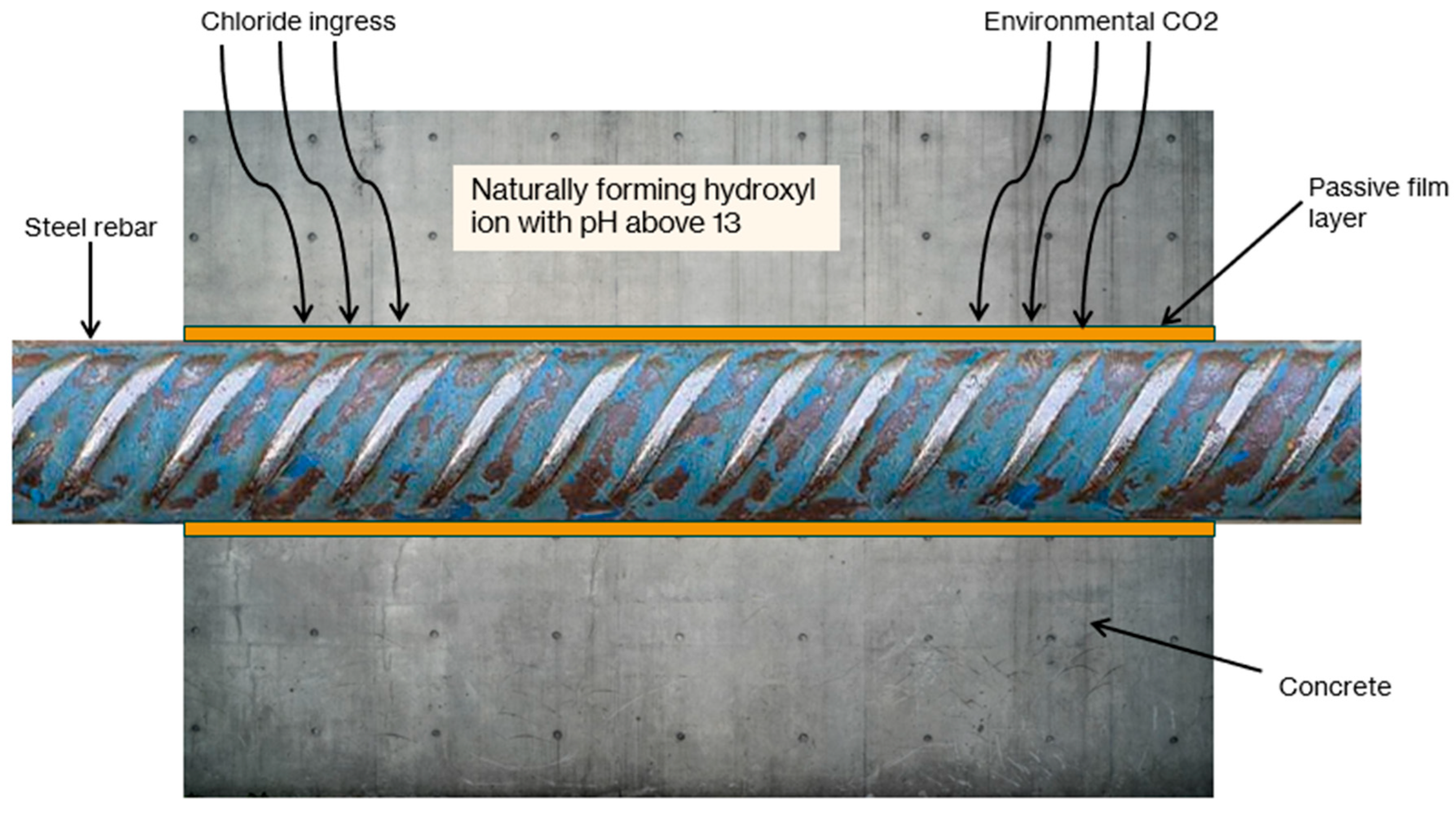 - Carbonation-Induced Corrosion: Atmospheric CO2 reacts with alkaline phases, consuming the alkaline reserve and reducing pore solution pH. When carbonation reaches the reinforcement depth and pH drops to about 11 or below, the passive film stability is compromised, with complete depassivation typically observed around pH 9 to 10 [6,30]. Carbonation-induced corrosion is dependent on concrete resistivity, porosity and degree of saturation [3].