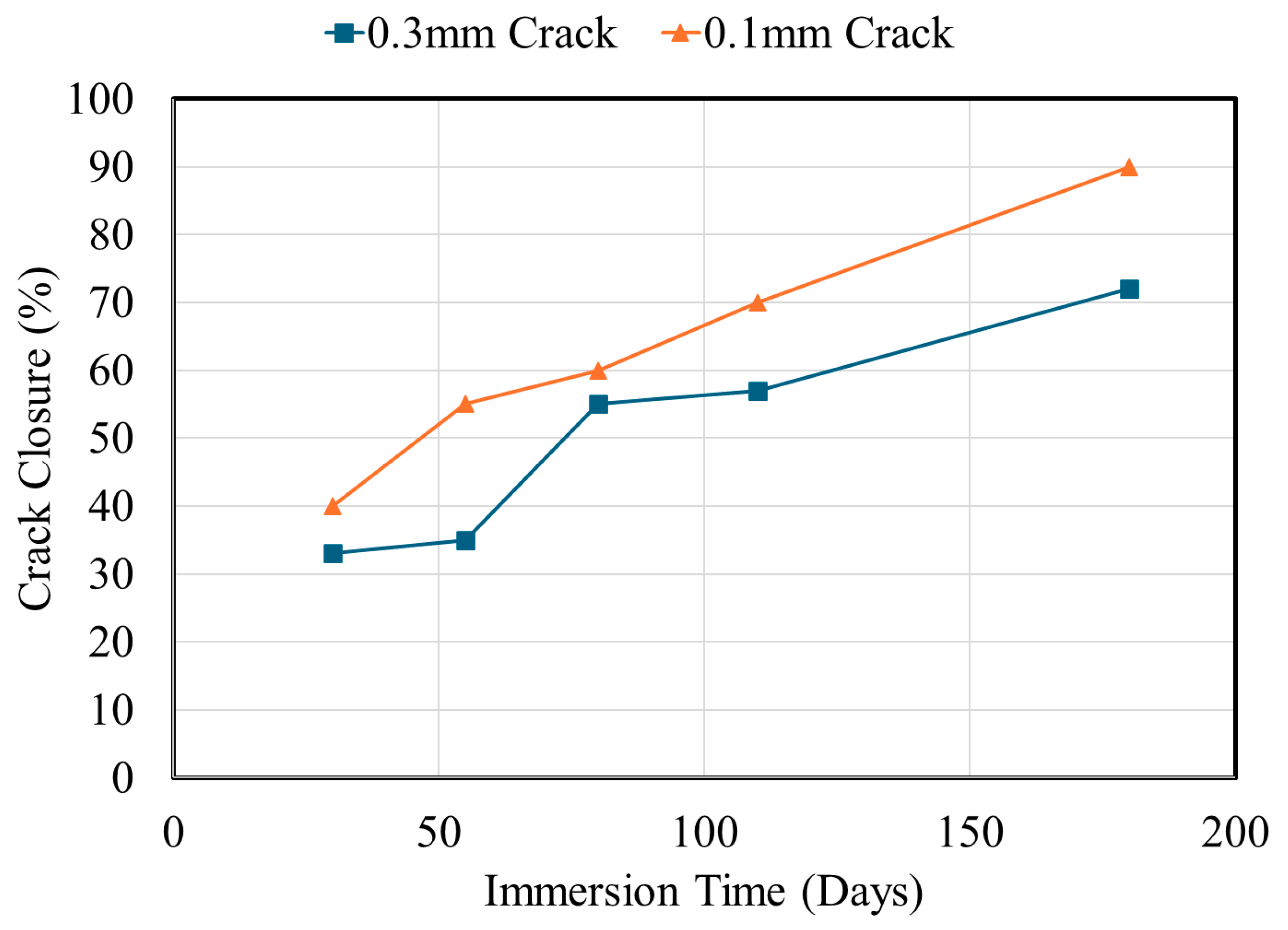 - Water Permeability and Sorptivity: As water is a key electrolyte in corrosion, its ingress is a critical indicator. Permeability tests, for example, BS EN 12390-8 [32] measure water flow under pressure, while sorptivity tests such as ASTM C1585 [33] assess the rate of water absorption in unsaturated concrete. Significant reductions in these values after healing are vital for corrosion mitigation [34].
