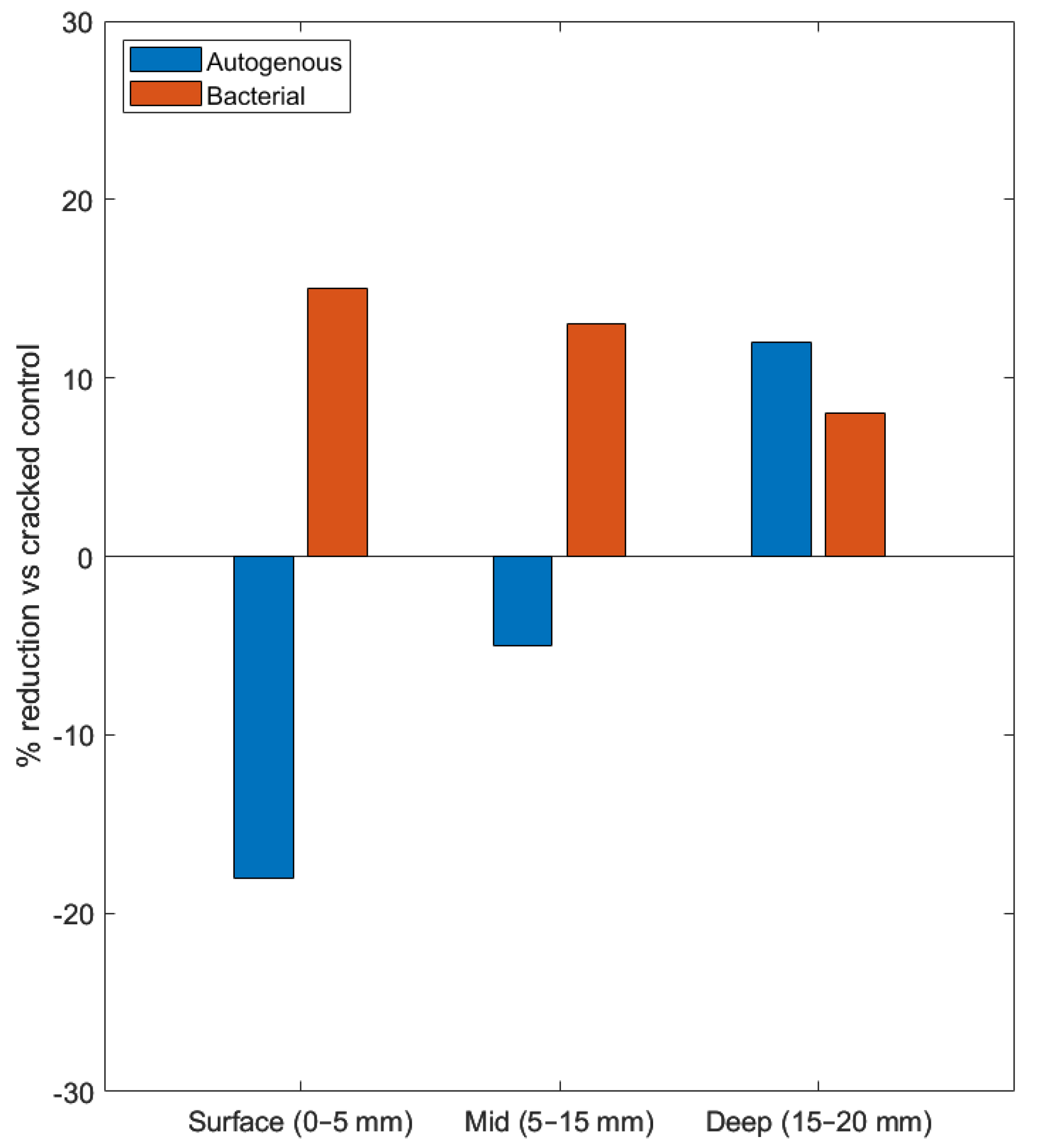 - Healing mechanisms exhibit characteristic spatial signatures. Autogenous and microbial approaches preferentially seal surface zones with depth-dependent attenuation. In contrast, low-viscosity encapsulated polymers can achieve greater depth continuity, while chemical or biological interface modifiers aim to secure passivity independently of bulk crack closure.