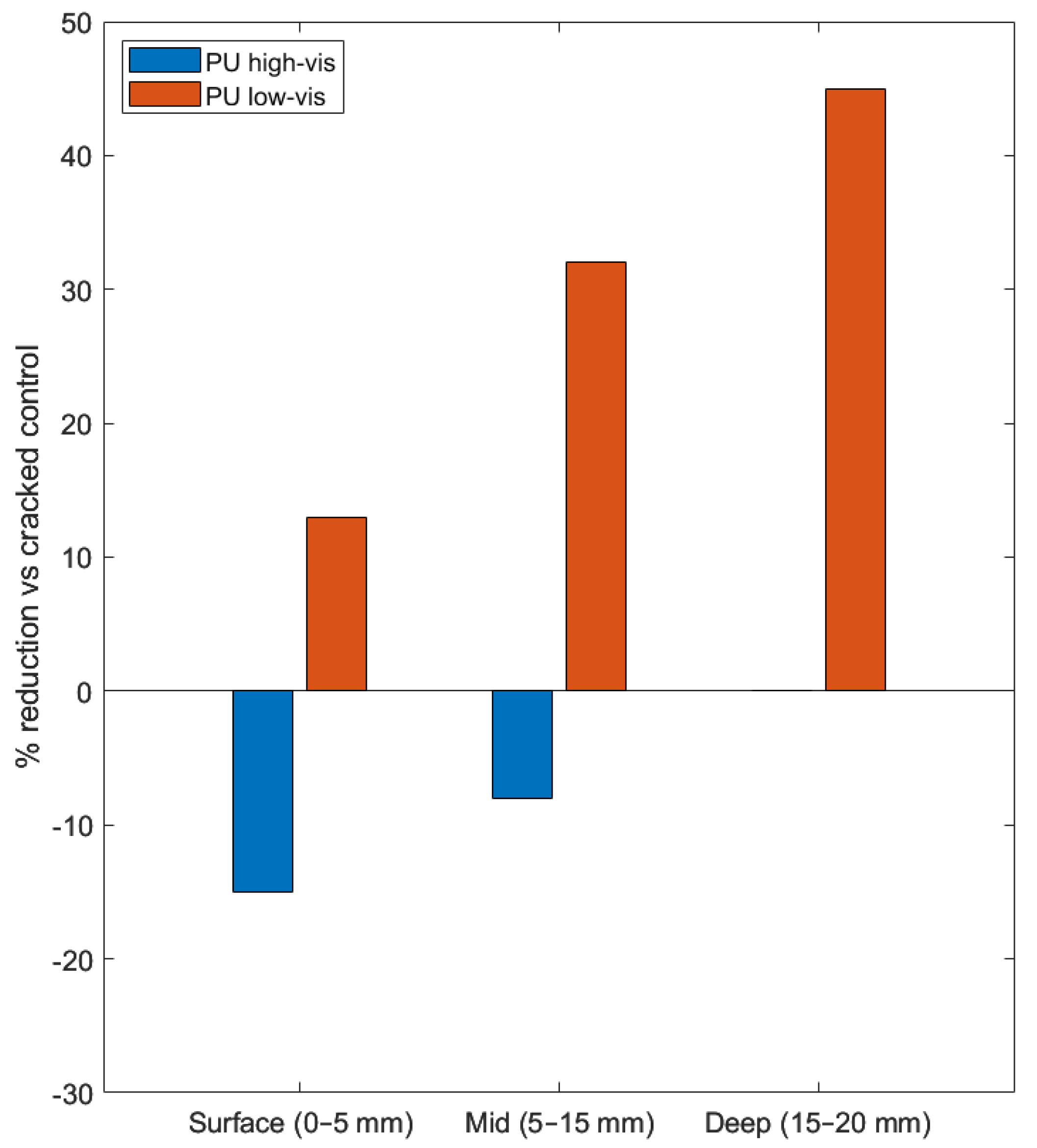 - Encapsulated low-viscosity polymers demonstrate superior penetration to reinforcement depth and exhibit the strongest coupling between chloride reduction and electrochemical protection. High-viscosity formulations primarily seal surfaces but fail at depth, underscoring the critical importance of viscosity selection. These systems are suitable for moderate cracks in chloride-rich environments.