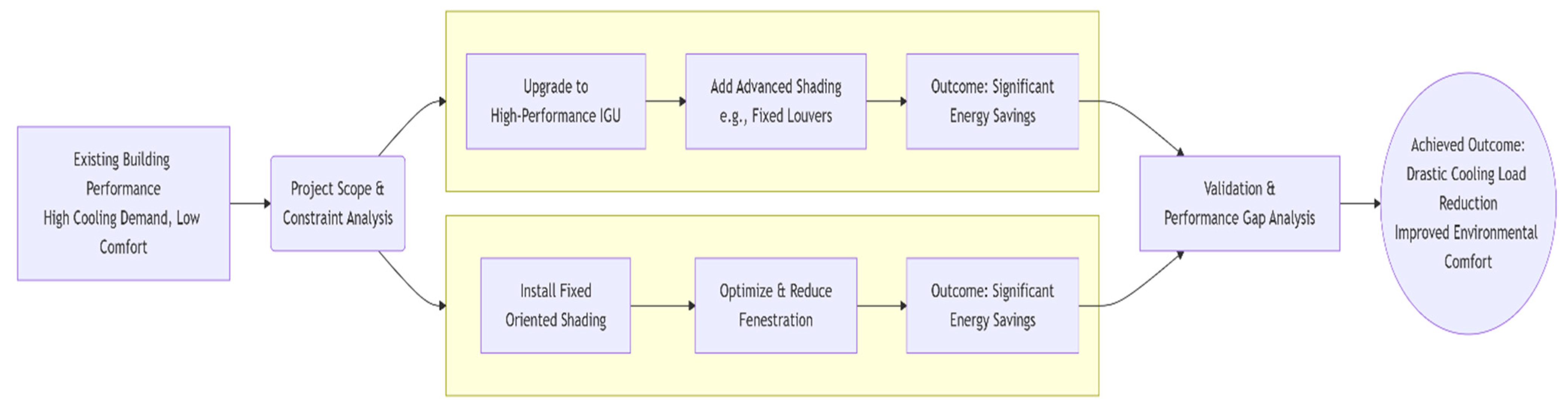 A generalized strategic framework for fertilized retrofitting is derived from the comparative analysis of case studies in Saudi Arabia. The process begins with a significant analysis of the project deficiency (budget, performance goals, and inheritance status), leading to two primary routes. Pathway A (Glazing Fund) as a fundamental step prioritizes the installation of high-performance untouched glazing units (IGU), followed by complementary shading. Pathway B (Shedding Fixed) prefers the installation of orientation-specific enhancing equipment, followed by fanning optimization. Both ways converge on the requirement for post-retrofit verification through performance interval analysis, leading to a sharp decrease in energy consumption and the shared result of enhanced comfort. The choice of the route is accidental due to the lack of an initial project, a flexible model that offers a flexible model for permanent building optimization in warm-dry areas.