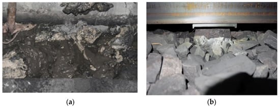 The subject tunnel traverses a geologically complex zone characterized by frequent lithological variations. The rock mass exhibits well-developed fine and cross-bedding, coupled with low interlayer bonding strength. This condition is particularly pronounced in interbedded sequences of thin mudstone, shale, and sandstone, rendering these strata highly susceptible to spalling and delamination. The hydrogeological regime is equally complex, featuring an extensive and interconnected system of surface water and groundwater. Furthermore, the presence of confined aquifers with significant hydraulic connectivity is observed in certain sections. The tunnel site is situated in a mid-low mountainous terrain with a general topographic gradient descending from north to south and from east to west. The Standard for Engineering Classification of Rock Masses (GB/T 50218-2014) [30] provides the following definitions for poor-quality rock masses. Class IV, characterized by poor stability, is similar to Class III but is distinguished by a higher density of weak structural planes that can form fractured zones under 2.0 m in width. Locally, a crushed (cataclastic) structure is present, accompanied by significant groundwater activity. Class V rock mass is considered extremely unstable, typically comprising strongly to completely weathered rock that is heavily influenced by geological structures. Joints and fissures are extensively developed, and fault fracture zones are wider than 2.0 m, with fractures commonly filled with clay. Furthermore, groundwater activity is strong, leading to a notable water influx. Based on this standard, it was determined that Class IV and V rocks account for 70.4% of the tunnel’s total length, highlighting the overall poor quality of the surrounding rock mass. The tunnel is a double-track, heavy-duty railway structure, featuring a composite lining system throughout its entire cross-section. It comprises a left track for loaded freight trains and a right track for returning empty consists. Since its commissioning, the tunnel has manifested various structural defects, including, notably, mud pumping and foundation subsidence, as documented in Figure 1.