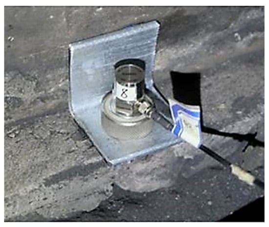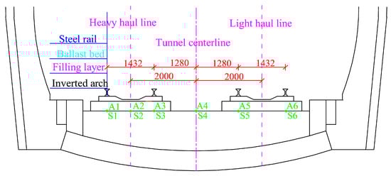 Two test sections were established to investigate the dynamic behavior of the tunnel foundation: one situated in an area of intact Grade-V surrounding rock, and the other in a region containing a void within the same rock classification. At each section, six measurement points were strategically deployed. These points were positioned directly beneath the left and right rails of the heavy-haul track, at the center of the heavy-haul track, along the tunnel centerline, and beneath the left and right rails of the adjacent non-operational (or empty) track. A schematic diagram of the sensor layout is presented in Figure 4, and a photograph of the on-site implementation is shown in Figure 5. The Digital Signal Processing (DSP) vibration testing system is selected for the on-site monitoring equipment. A fiber grating stress sensor with a range of 0.5 MPa is selected for the monitoring instrument. The vibration monitoring equipment is an IEPE piezoelectric acceleration sensor with a range of ±50 m/s2, a response frequency of 2~10,000 Hz, a resolution of 5 × 10−4 m/s2, and an installation resonance frequency greater than 35 Hz.