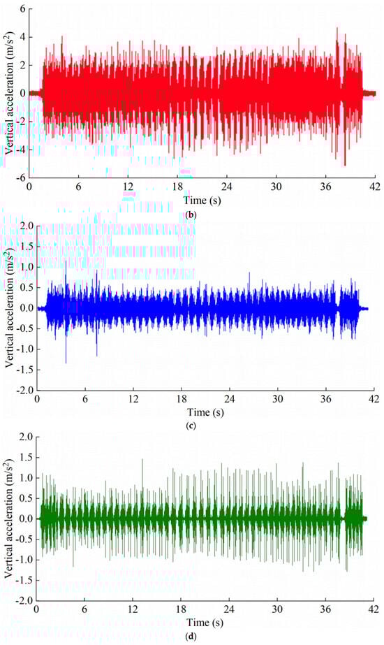 Time–history curves of vertical acceleration at measuring points A1 and A4: (a) A1, Intact section; (b) A1, Void section; (c) A4, Intact section; (d) A4, Void section.