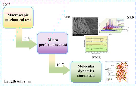 Multiscale analysis can better elucidate the interface bonding behavior between polymers and cementitious materials, with the introduction of molecular dynamics (MD) simulation techniques providing an opportunity for this []. Lijuan L et al. [] adopted an integrated approach combining experimentation and simulation. They utilized molecular dynamics simulations to reveal the modification mechanisms and validate the macro- and micro-scale test results. The research conducted by Na Z et al. [] involved molecular dynamics simulation to examine both the adsorption and diffusion properties of ions at different concentrations, as well as the behavior of water molecules.