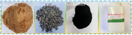 The fine aggregate used in this study is river sand (Figure 2a) with a fineness modulus of 2.6 and particle sizes between 0.25 and 0.40 mm. The coarse aggregate consists of gravel (Figure 2b), its maximum dimension is 19 mm, with a specific gravity of 2.6. The high strength rubber, depicted in Figure 2c, is sourced from Shanghai Chenqi Chemical Technology Co., Ltd. (Shanghai, China), with its physical and mechanical characteristics detailed in Table 1. The SBL utilized in this investigation, illustrated in Figure 2d, is supplied by Shenzhen Yoshida Chemical Co., Ltd. (Shenzhen, China), with its technical specifications outlined in Table 2. Portland cement (PO42.5), employed in this study, is furnished by China Hebei Cement Co., Ltd. (Shijiazhuang, China), boasting a design strength of 30 MPa.