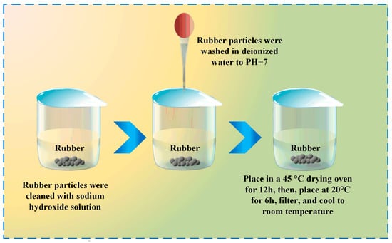 When rubber particles replace part of the fine aggregate in concrete, the weak bonding at the rubber–cement interface generally reduces compressive strength []. Surface pretreatment of rubber is considered the most effective strategy to mitigate this adverse effect [,]. Therefore, pre-treating rubber particles with sodium hydroxide to remove substances from the surface of rubber powder, reduce surface voids, and avoid untreated rubber surface roughness and porosity is essential. The entire process is illustrated in Figure 3 [].