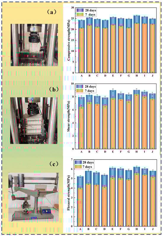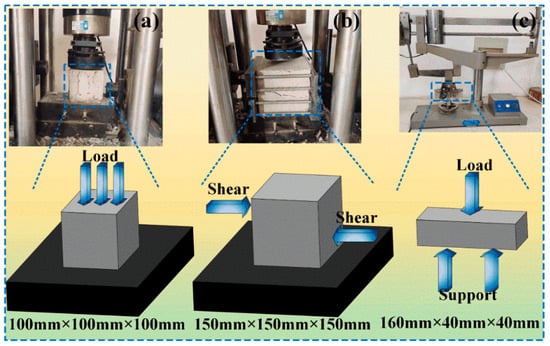 To understand the mechanical properties of SBL/rubber composite concrete, researchers conducted mechanical tests on the composite samples at specified curing ages (7 and 28 days). These tests followed the guidelines stipulated in the “Standard for Test Methods of Concrete Physical and Mechanical Properties” (GB/T 50081-2019 []). The specimens used for compressive strength tests had dimensions of 100 mm × 100 mm × 100 mm, while those for shear strength tests were sized at 150 mm × 150 mm × 150 mm. The equipment used for shear strength tests was the Y250 digital stress-controlled direct shear tester. For flexural strength tests, the specimen dimensions were 40 mm × 40 mm × 160 mm and a DKZ-5000 electric bending testing machine was used (Wuxi Jianyi, Wuxi, China). The instruments and their operational principles are illustrated in Figure 4.