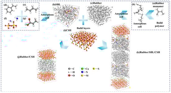 Given the predominant use of synthetic rubber in current production and applications, a unit cell with a density of 1.93 g/cm3 was selected for the rubber model based on the main components of hydrocarbons in the experimental materials. Five rubber monomers, as shown in Figure 5a, were assembled to form polymer chains in the build polymer step, depicted in Figure 5b. Subsequently, an amorphous cell was formed to create an indefinite unit cell (Figure 5c), with dimensions a = 20.20 Å, b = 20.20 Å, c = 20.87 Å, and τ = 90°. For the styrene–butadiene latex model, a unit cell with a density of 1.01 g/cm3 was chosen based on the main components of the experimental materials. Benzene monomers (Figure 5d), butadiene monomers (Figure 5e), ammonium persulfate monomers (Figure 5f), and acrylic acid monomers (Figure 5g) were combined in a ratio of 62:30:4:4 to form an amorphous cell (Figure 5h), with dimensions a = 20.20 Å, b = 20.20 Å, c = 20.87 Å, and τ = 90°. The primary binding phase in concrete materials is calcium silicate hydrate () gel, which accounts for 70% of cement hydration products and significantly influences the properties of cement and concrete [,]. Previous studies have demonstrated that the molecular structure model of Tobermorite can well match various parameters of actual []. Therefore, an initial model of Tobermorite with a size of 1.1 nm was derived from the inorganic crystal database. Subsequently, it was sliced, extended, and combined along the crystal plane [0 0 1] to form nanoscale pores, with a thickness of approximately 11.0 Å on one side of the substrate. Placed within a lattice with dimensions a = 20.20 Å, b = 20.20 Å, c = 11.00 Å, and τ = 90° and a vacuum layer thickness of , utilizing this configuration, the gel pore was fashioned to serve as the model for the cementitious substrate, illustrated in Figure 5i. To evaluate the effect of SBL on the adsorption behavior of at the interface, two initial models were formulated: one without SBL doping and one with SBL doping. The initial model without SBL doping was formed by building layers of rubber (Figure 5c) and (Figure 5i), resulting in the model (Figure 5j). On the other hand, the initial model with SBL doping was created by building layers of SBL (Figure 5h), rubber (Figure 5c), and (Figure 5i), leading to the model, as depicted in Figure 5k.