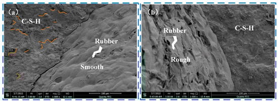 As shown in Figure 7a, after the destruction of low-parameter SBL/rubber concrete, the rubber surface leaves a smooth trace, and the cement-based surface has more holes and gaps. It can be seen in Figure 7b, that after the destruction of rubber concrete after adding SBL, the rubber surface is obviously rough, the cement-based surface is also more-dense, and the holes and gaps are greatly reduced. The bond strength and interfacial toughness are improved. The SBL fills the pores, enabling the rubber to establish a strong bond with the cement base, thus enhancing the bond strength between the components. The findings indicate that the interfacial bonding provided by SBL mitigates cracking in the composite concrete, while its incorporation enhances the adhesion between the rubber particles and the cement paste.