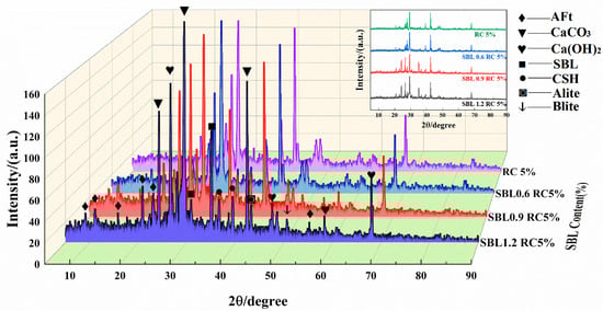 XRD analysis of samples stored for 28 days was performed to determine the phase composition and content of SBL and rubber composites. The experimental process proceeded in the following manner: chunks of rubber concrete (RC) devoid of direct stress, alongside those featuring a 5% rubber substitution, and exhibiting SBL parameters of 0.6%, 0.9%, and 1.2%, underwent immersion in anhydrous ethanol for 48 h to stop hydration reactions. Subsequently, it was ground into a powder. This was followed by a 24 h drying treatment conducted in a vacuum oven at 50 °C. The resulting powder was then shaped into a 15 mm × 15 mm flat surface for analysis in a diffractometer.