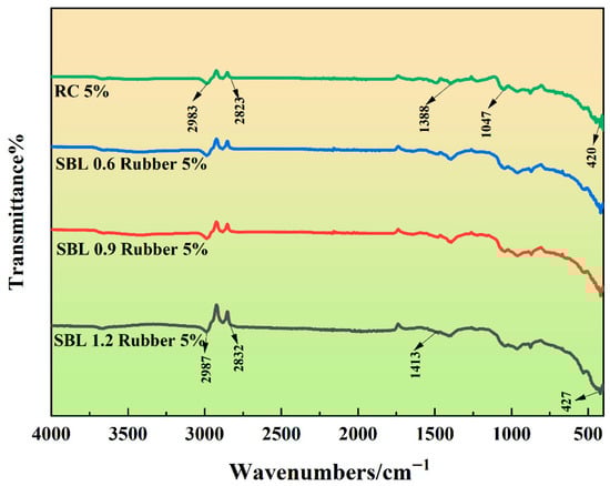 Observing Figure 9, it becomes evident that FT-IR results of rubber concrete after SBL addition resemble those of RC, suggesting the absence of a chemical reaction between SBL addition and rubber []. Notably, as the SBL content increases from 2832 cm−1 to 2987 cm−1 and from 427 cm−1 to 1413 cm−1, the strength of the vibration bands increases. This indicates that the addition of SBL reduces the hydration reaction of the cement matrix and increases the gel content at the same time, which aligns with previous findings []. The heightened gel quantity strengthens the bond between rubber and cement-based interfaces, thereby enhancing the properties of rubber concrete.