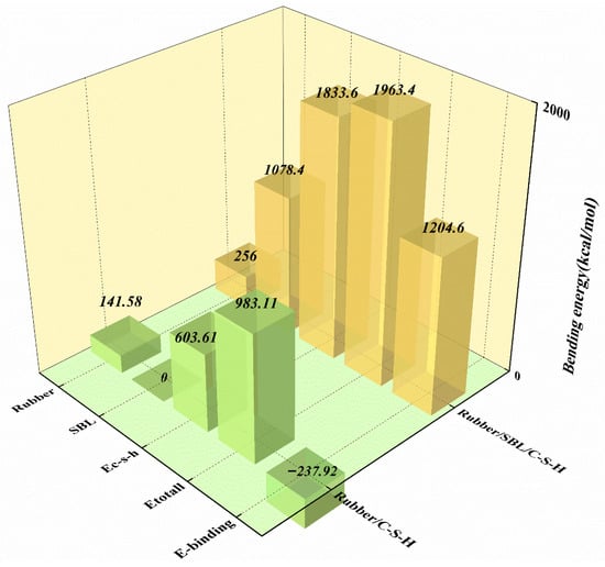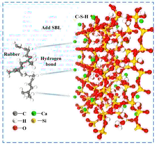 The pivotal bond between gels and various polymers at the interface is the ionic bond formed by hydrogen bonds with []. As shown in this study, molecular dynamics simulation results demonstrate that the addition of SBL promotes the formation of a hydrogen bond between the hydrogen atom of rubber and the calcium atom of CSH. This strengthens the interface bonding between rubber and CSH, thereby improving the overall properties of rubber concrete. This effect is illustrated in Figure 14.