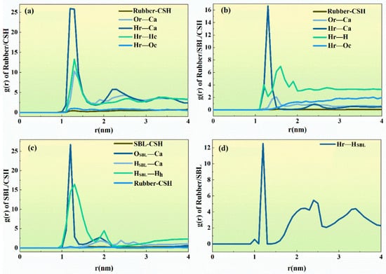 The intermolecular forces, comprising hydrogen bonding and van der Waals interactions, are at play. Through the force module, the radial distribution functions (RDFs) for both systems are calculated. Figure 11a,b illustrates that the primary interaction at the interface is a interaction. Notably, the peaks observed for and are significant, emphasizing the crucial role of the ionic bond formed by in enhancing the interface interactions between the polymer and . Contrasting with Figure 11a,b, Figure 11c,d show variations in the RDF values of and . This suggests that the addition of SBL promotes enhanced interface interactions between the polymer and cement base. Moreover, the increase in the peak in Figure 11d indicates that the introduction of SBL enhances the hydrogen bonding between rubber and CSH, thereby strengthening the interfacial interaction between them.