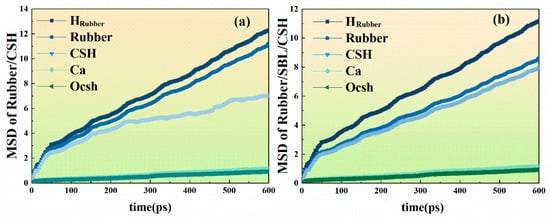 The calculation results of the mean square displacement of the two systems ( and ) are shown in Figure 12. Figure 12a,b reveal that the MSD value for rubber exceeds that of , indicating the latter’s superior structural stability. Additionally, the MSD curve for hydrogen atoms in rubber outstrips that of other atoms, indicating heightened activity at the interface. Conversely, both calcium and oxygen atoms in maintain consistently low MSD values, underscoring the stability of the structure. Noteworthy is the varying degrees of decline in MSD values within the curve of Figure 12b compared to Figure 12a, while the sequence of atomic MSD values remains largely unaltered. This suggests that the free mobility of H, Ca, and O within the channel experiences inhibition following the addition of SBL. However, this modification likely does not compromise the overall stability of the system. Instead, it strengthens the hydrogen bond interactions between and , thereby improving the interface bonding between rubber and CSH. As a result, the overall performance of the concrete is enhanced.