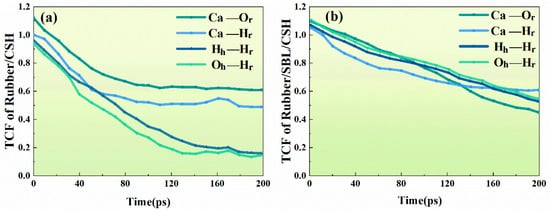 The TCF calculation results for the first 200 ps of the main atoms of the two systems are shown in the figure. The activity patterns of O and H atoms in water molecules are consistent in both systems. This alignment validates the model’s rationality. As shown in Figure 13a, the hydrogen bonding effect in the system shows a downward trend before 125 ps and then stabilizes at about 0.18 for a long time. Illustrated in Figure 13b, the TCF curve of the H bond in exhibits a slight initial decrease before stabilizing around 0.6. This suggests that SBL improves the hydrophilicity of the rubber surface. Moreover, when comparing the TCF values of and in the two systems, it is observed that the TCF value of experiences a rapid decline, reaching stability by 120 ps, whereas the TCF value of SBL decreases gradually throughout the calculation. This observation indicates that SBL delays the fracture of the two coordinate bonds, confirming its substantial influence on the interaction at the interface.