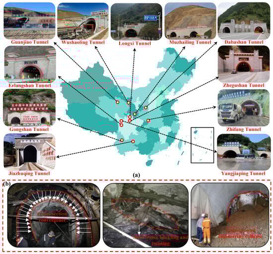 As China’s economy continues to grow robustly and the “Belt and Road” initiative advances steadily, the scale of tunnel and underground engineering construction has been expanding year by year. Concurrently, national infrastructure development is now prioritized in central and western regions, areas characterized by increasingly complex topographic, geological, and geomorphological conditions [1]. Among them, deep underground engineering crossing soft rock strata with great burial depth continues to emerge (see Figure 1a). Due to the poor stability of soft rock itself, coupled with the environment of high geostress, high ground temperature, and high-permeability water pressure (“three highs”) in deep underground engineering, large-scale excavation disturbances can easily trigger surrounding rock instability and failure, leading to a series of serious engineering accidents such as cross-section reduction, lining cracking, and even large-scale collapse [2,3,4] (see Figure 1b). During the construction of the Lianchengshan Tunnel of the Baoji–Hankou Expressway, serious squeezing and large deformation disasters occurred due to chlorite schist, which were manifested in the distortion and fracture of the steel frame, cracking and falling of shotcrete and inverted arch bottom heave, resulting in serious lag of project progress and huge losses [5]. The surrounding rock of the Haba Snow Mountain Tunnel on the Dian–Tibet Railway mainly consists of fragmented and foliated basalt interbedded with tuff. During construction, extremely severe large deformation problems also occurred, causing serious damage to the support structures. In particular, the secondary lining was entirely crushed over a length of 189 m, resulting in significant construction delays and seriously affecting tunnel construction safety [6]. Therefore, investigating the key factors and sensitivity governing large deformations in soft surrounding rock is essential to enhance safety, mitigate potential risks, and optimize cost efficiency in deep underground engineering projects.