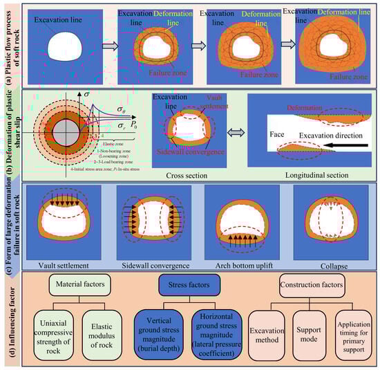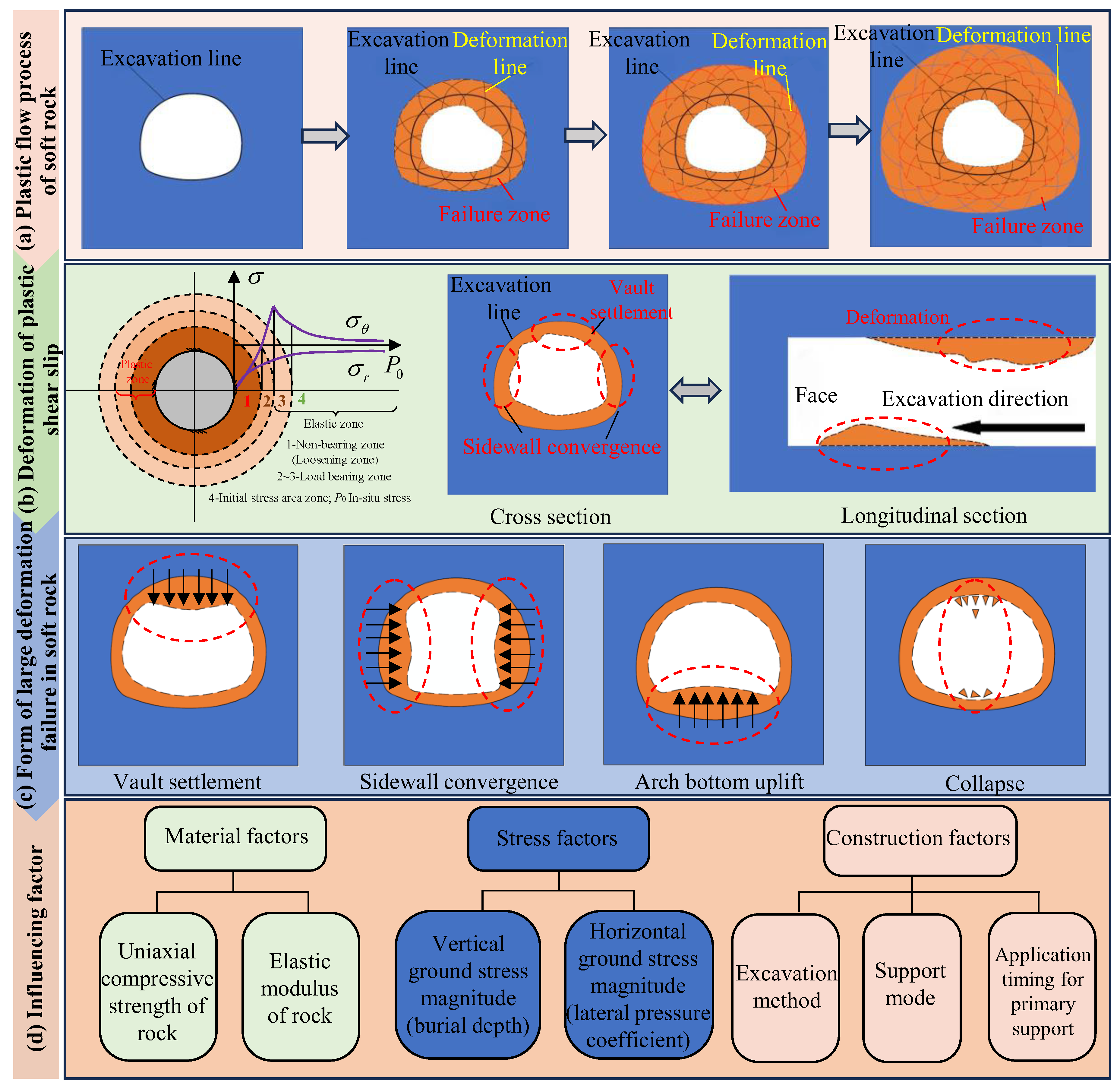 - The large deformation of soft surrounding rock is divided into three categories: material-induced large deformation (material-stress-induced and material-chemical-induced), stress-induced large deformation, and structural-type large deformation. The material-stress-induced large deformation is a large deformation phenomenon of soft rock plastic flow or shear slip under the dual action of low rock material strength and high ground stress. The influencing factors of large deformation are divided into material factors, stress factors, and construction factors.