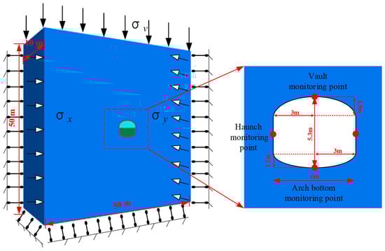 The cross-section of the carve is characterized by a vertical wall arch and a minor bottom arch. The width is 6.0 m, and the height is 5.3 m. The vault is a circular arc with a radius of 3.0 m and a vector height of 1.9 m. The height of the section straight wall is 2.3 m, and the height of the bottom arch is 1.1 m. The specific size of the numerical model for the underground engineering is illustrated in Figure 3. A vertical load is exerted on the model’s top boundary to simulate the overburden stress, whereas displacement constraints are employed on the lateral and bottom boundaries. Assuming an excavation depth of 1200 m for the underground engineering, the overlying strata (γ = 25 kN/m3) are converted into a geostress of σ1 = 30 MPa and applied on the upper surface of the computational model (z = 25 m). A stress boundary condition was prescribed at the model’s top surface, while its bottom (z = −25 m) was treated as fully fixed in all degrees of freedom. and displacement constraints are applied on the left and right (x = ±25 m) and front and back (y = 0, y = 10 m) boundaries of the model. Meanwhile, horizontal geostresses σ2 = σ3 = 45 MPa are applied. Considering computational efficiency, except for different excavation methods, the right half of the model is used for analysis based on model symmetry.