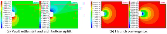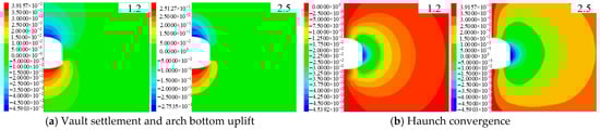 In FLAC3D, a model is considered to have reached computational equilibrium when the maximum unbalanced force at each grid node is very small compared to the total applied force in the problem. If the unbalanced force approaches a constant non-zero value, the computational model may undergo failure and plastic flow. The aforementioned simulation, with a low uniaxial compressive strength of 0.5 MPa, may experience plastic flow and fail to reach a stage of convergence. Therefore, this paper does not consider the subsequent stage of plastic flow and bases its analysis solely on the state when the calculation stops upon the maximum unbalanced force ratio being less than 1 × 10−5. The deformation cloud image of the surrounding rock after excavation is calculated. In view of the space limitation, this paper only lists the displacement cloud image of the surrounding rock when the uniaxial compressive strength of the surrounding rock is 0.5 MPa and 30 MPa, as shown in Figure 4.
