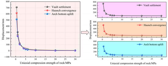 Figure 4 illustrates that increasing the surrounding rock uniaxial compressive strength leads to a progressive reduction in all displacement values: vault settlement, arch bottom uplift, and haunch convergence. The surrounding rock deformation demonstrates a strong negative relationship to uniaxial compressive strength, which is consistent with established principles. Within the range of 0.5 to 30 MPa, the settlement and uplift were even reduced by approximately 150 times. To better understand the effect of varying uniaxial compressive strengths on surrounding rock deformation in underground engineering, the peak values of vault settlement, arch bottom uplift, and haunch convergence from the simulation data were compiled for analysis, enabling plots of displacement variation under different strengths to be generated, as shown in Figure 5.