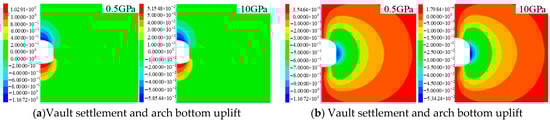 In Figure 6, as the elastic modulus increases, the displacement values—vault settlement, arch bottom uplift, and haunch convergence—show a progressive reduction. The rock mass deformation and elastic modulus show a significant negative correlation, which conforms to the existing law. In the range of 0.5–10 GPa, the displacement of the three is reduced by about 20 times. The maximum displacement values were obtained and plotted against varying elastic moduli. As illustrated in Figure 7, the resulting deformation trends-namely, vault settlement, haunch convergence, and arch bottom displacement—all demonstrate a high degree of consistency. Taking the vault settlement displacement as an example, when the elastic modulus is less than 4 GPa, the vault settlement decreases from 1167.2 mm to 147.09 mm, a decrease of about 87%, and the downward trend is more pronounced. When the elastic modulus is 4–10 GPa, the vault settlement displacement decreases from 147.09 mm to 58.54 mm, with a decrease of about 60%. The downward trend is relatively gentle, and the development trend tends to converge. From the results, it can be observed that an increase in the surrounding rock’s elastic modulus significantly reduces deformation quantities such as vault settlement, arch bottom uplift, and haunch convergence. This indicates that material stiffness plays a critical role in controlling large deformations in deep soft rock. Boosting this property significantly enhances the structural integrity of the rock mass, consequently lowering the potential for failure. In practical engineering, this finding suggests that priority should be given to measures that increase the overall stiffness of the support system during design, such as optimizing the performance of lining materials or enhancing the strength of initial support.