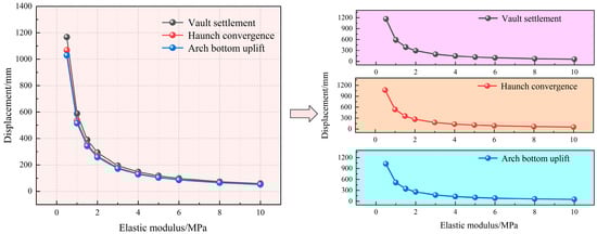 Displacement variation curve of the surrounding rock with different elastic moduli.