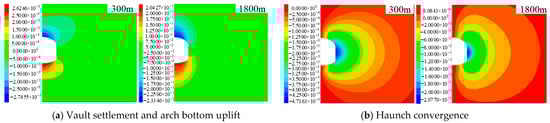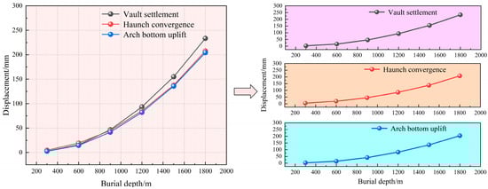 As illustrated in Figure 8, increasing burial depth leads to progressively larger displacements in the form of vault settlement, arch bottom uplift, and haunch convergence. The deformation of the surrounding rock shows a significant positive correlation with buried depth, which is in line with the existing law. The maximum values of the three displacements in the simulation results are extracted, and the curves under various buried depths of underground engineering are drawn as shown in Figure 9. It can be seen from the figure that the settlement of the surrounding rock vault, the convergence of the haunch, and the uplift displacement of the arch bottom increase with the increase of buried depth. Taking the settlement displacement of the vault as an example, in the range of 300~1800 m, the settlement of the vault increases from 2.75 mm to 233.46 mm, an increase of about 85 times, and the rise of each buried depth section shows an increasing trend, indicating that the buried depth is very sensitive to the deformation of the surrounding rock. In deep underground engineering in soft rock strata, the surrounding rock is subjected to high geostatic stresses, significantly increasing the risk of major deformation. Therefore, sufficiently rigid support measures must be employed during the initial construction phase to effectively control excessive displacement.