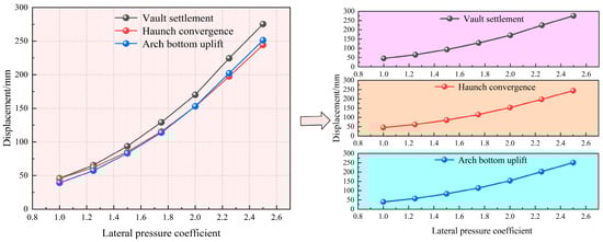 As illustrated in Figure 10, as the lateral pressure coefficient increases, the displacement values, including vault settlement, arch bottom uplift, and haunch convergence, gradually increase. The surrounding rock deformation demonstrates a significant positive relationship to the lateral pressure coefficient. The maximum value of the displacement of the three in the simulation results is extracted, and the displacement curve of the surrounding rock under different lateral pressure coefficients is drawn as shown in Figure 11. Figure 11 demonstrates a corresponding growth in the displacements of the vault, haunch, and arch bottom as the lateral pressure coefficient increases, confirming a uniform trend in surrounding rock deformation. Taking vault settlement displacement as an example: in the range of lateral pressure coefficient of 1~2.5, the vault settlement increases from 45.9 mm to 273.35 mm, an increase of about 6 times, which is more sensitive to surrounding rock deformation.