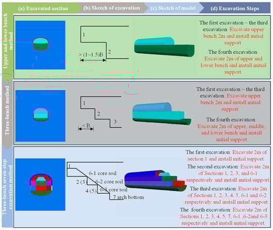 According to the design of the above excavation method, different excavation methods are adopted to excavate the underground engineering and carry out the initial support. In the actual simulation, the parameters of the rock mass were replaced to approximate the effect of the initial support. The calculation model and excavation steps of different excavation methods are illustrated in Figure 12, and Table 4 presents the initial support parameters. The displacement of surrounding rock under different excavation methods is affected by the excavation steps and step length. Therefore, it is of great significance to study the displacement variation law and final deformation of each part to study the stability of the surrounding rock of underground engineering under different excavation methods. The monitoring points under the y = 5 m section are extracted, and the vault settlement, haunch convergence, and arch bottom uplift displacement are analyzed.