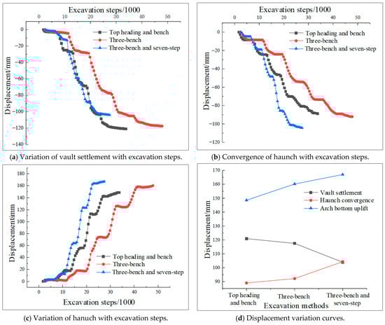 As shown in Figure 13a, the settlement of the vault under different excavation methods changes with the excavation step. From the diagram, it can be seen that the variation law of the vault settlement with the excavation step under the three excavation methods is similar, and the variation law of the vault settlement with the excavation step during the construction process can be summarized into three stages. The first stage is the advanced slow settlement. This stage is mainly due to the initial effect of the construction process on the rock mass in front of the tunnel face, which causes the stress redistribution of the upper surrounding rock and causes the rock mass in front of the tunnel face to settle first. The second stage is the excavation deformation stage. As the tunnel face progresses, the varied phases of the three excavation techniques start to exert influence on the overlying rock mass. The vault settlement generated under this disturbance is more obvious than the settlement generated in the first stage. And the vault settlement changes under the three methods began to distinguish, and the settlement value and deformation rate began to increase. The third stage is the deformation convergence stage.