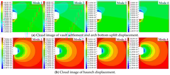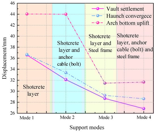 As presented in Figure 15, from support mode 1 to support mode 4, both the vault settlement and the haunch convergence displacement exhibit a progressive reduction, with their variation trends showing strong consistency. This suggests that the supporting structure provides increasingly effective constraints on both the vault and haunch areas. Vault settlement showed a reduction of 9.75 mm, declining from an initial 36.59 mm to 26.84 mm. Compared to the impact of the aforementioned factors on vault settlement displacement, different support modes merely provide a supplementary constraint to the surrounding rock. This constraining effect is far less significant than the influence of material and stress factors. From the displacement change process from support mode 3 to support mode 4, it can be seen that the vault settlement decreased by only 1.85 mm, indicating that the support effect of underground engineering using mode 4 is excessive, which will lead to high construction and material costs. Under the second support mode, the absence of anchor rods at the arch bottom results in their inability to restrain uplift deformation. Therefore, the layout of anchor bolts requires careful consideration during actual construction. The displacement of the arch bottom uplift under the four different support modes decreased from 44.04 mm to 31.67 mm, a decrease of 12.37 mm, and the decrease was obvious, but the sensitivity of the support effect to the stability of the surrounding rock was soft.