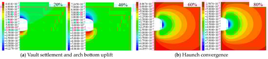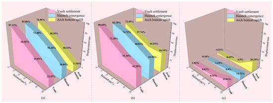 It can be seen from Figure 16 that the vault settlement is 87.13 mm at an 80% release rate, and the vault settlement is 22.47 mm at a 20% release rate. The displacement at key points in the surrounding rock under an 80% stress release rate exceeds that observed at a 20% release rate. It shows that the initial support should not be constructed too late, but the initial construction time is not too early, resulting in the stress can not be released in time, the surrounding rock can not fully bear its own stress, so that the support structure bears a large stress, resulting in the cracking and falling of the initial support and other bad phenomena. The displacement of the surrounding rock during the construction of the initial support and the convergence of the displacement of the surrounding rock after the initial support are extracted (Figure 17a,b). Figure 17c illustrates the variation in displacement at key surrounding rock locations across different stress release rates. From the figure, it can be seen that the displacement of the vault by the initial support of 20% release rate increased by 19.8 mm, the displacement of the vault by the initial support of 40% release rate increased by 8.31 mm, the displacement of the vault by the initial support of 60% release rate increased by 4.63 mm, and the displacement of the vault by the initial support of 80% release rate increased by 2.52 mm. Delayed initial support installation progressively reduces vault settlement, haunch convergence, and arch bottom uplift. Consequently, initial support should be applied at a displacement release rate of 4060% to maximize the surrounding rock’s bearing capacity and control excessive deformation.