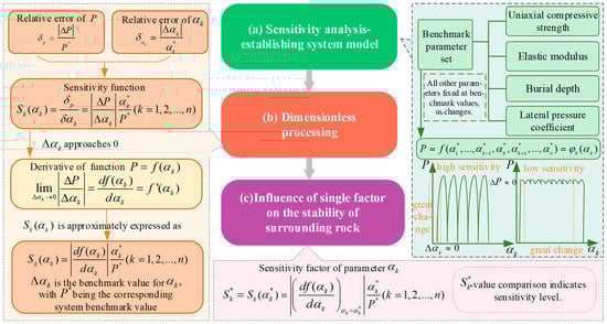 The first step of sensitivity analysis is to establish a system model (P is the system characteristic), and its benchmark parameter set is determined by the problem discussed [34]. This section focuses on evaluating the sensitivity of various factors affecting large deformation in deep underground surrounding rock, using actual reference values of uniaxial compressive strength, elastic modulus, and stress factors as the benchmark parameter set (α). When analyzing the influence of a parameter αk on the characteristic P, the remaining parameters can be taken as the reference value and fixed, so that αk changes within its possible range, and the relationship curve between the system characteristic P and the parameter αk can be drawn [35]. A minor alteration in αk resulting in a substantial variation in P indicates higher sensitivity of P to αk, whereas a diminished response signifies lower sensitivity (see Figure 18a). However, in practical systems, the parameters that govern system behavior are often distinct physical quantities with varying units. Consequently, their sensitivities cannot be directly compared using the aforementioned analysis. Therefore, dimensionless processing is required (see Figure 18b) [12]. According to the relationship obtained from the dimensionless treatment, the SK(αk)~αk curve can be further drawn to analyze the effect of an individual factor on surrounding rock stability (see Figure 18c). Among them, SK* consists of dimensionless, non-negative real numbers. By comparing the sensitivity factors corresponding to each parameter, the sensitivity of the system characteristics to each influencing factor can be obtained.