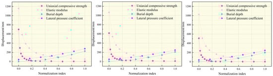 The influencing factors of material-stress-induced large deformation disaster in deep underground engineering are divided into three aspects: material, stress and construction factors. Among them, material and stress factors are quantitative factors, and construction factors are qualitative factors, so it is difficult to quantify them. Therefore, drawing on the results from Section 4 regarding vault settlement, invert uplift, and haunch convergence under various factors, the sensitivity of four material and stress indexes to the stability of different parts of underground engineering is analyzed. When analyzing the sensitivity of uniaxial compressive strength, elastic modulus, and stress factors, it is necessary to first carry out dimensionless processing and map each influencing factor index to the range of 0~1. According to the vault settlement, haunch convergence, and arch bottom uplift, the stability dependent variables are plotted as illustrated in Figure 19.