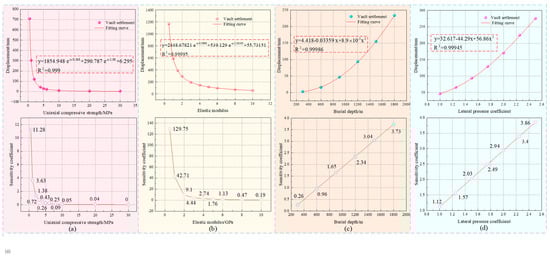 Fitting curve and sensitivity coefficient of surrounding rock: (a) Uniaxial compressive strength; (b) Elastic modulus; (c) Burial depth; (d) Lateral pressure coefficient.