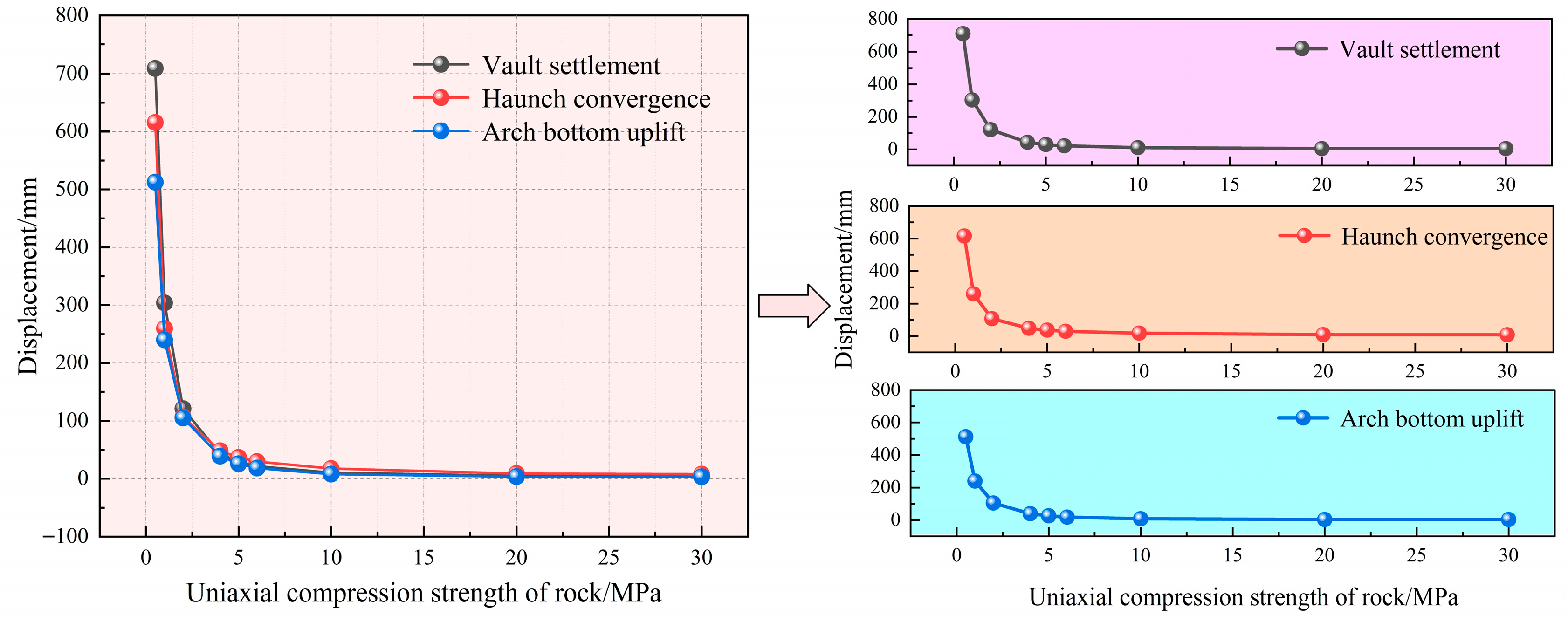 - The uniaxial compressive strength and elastic modulus of the material factors show a significant negative correlation with the deformation of the surrounding rock and eventually tend to converge. When the elastic modulus is less than 4 MPa, the settlement of the vault decreases by about 87%, and the downward trend is more severe. From the perspective of the overall displacement variation, the influence of elastic modulus is higher than that of uniaxial compressive strength; The stress factors have a significant positive correlation with the deformation of the surrounding rock. With the increase of stress factors, the displacement of surrounding rock will continue to increase in a relatively stable range. Material and stress factors differentially affect the peak displacement of various surrounding rock components. The vault settlement displacement is the most obvious, followed by the haunch convergence displacement, and the last is the arch bottom uplift displacement.