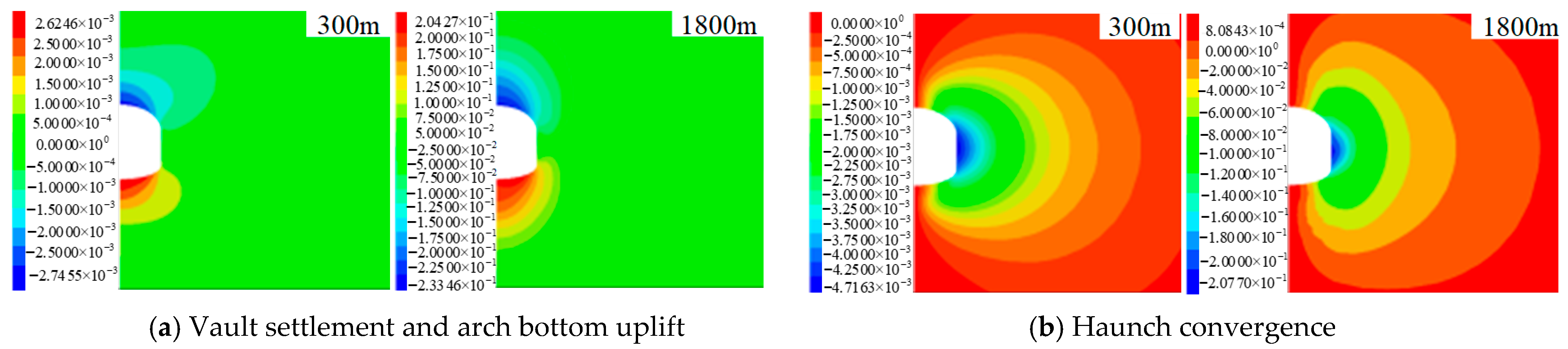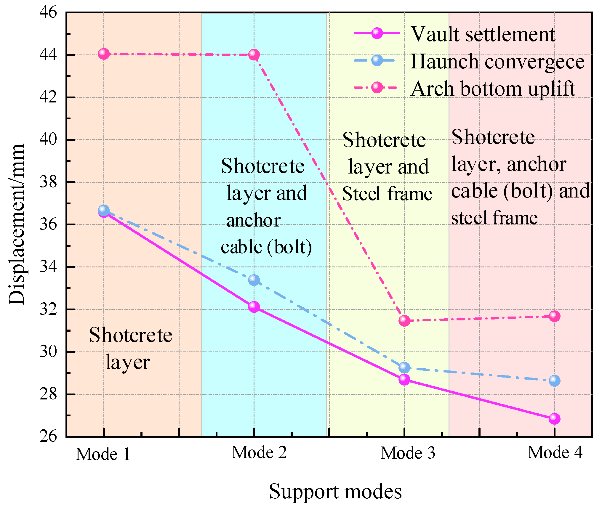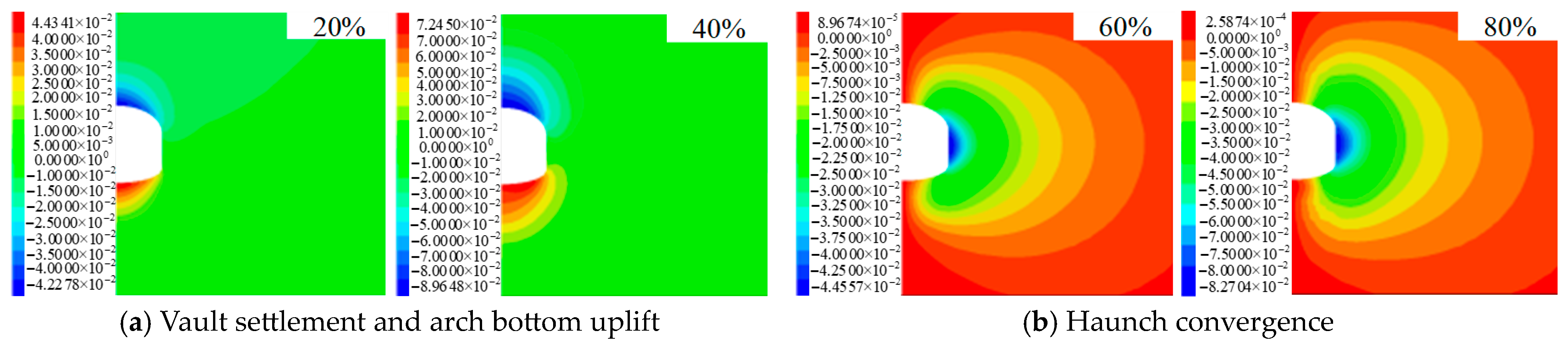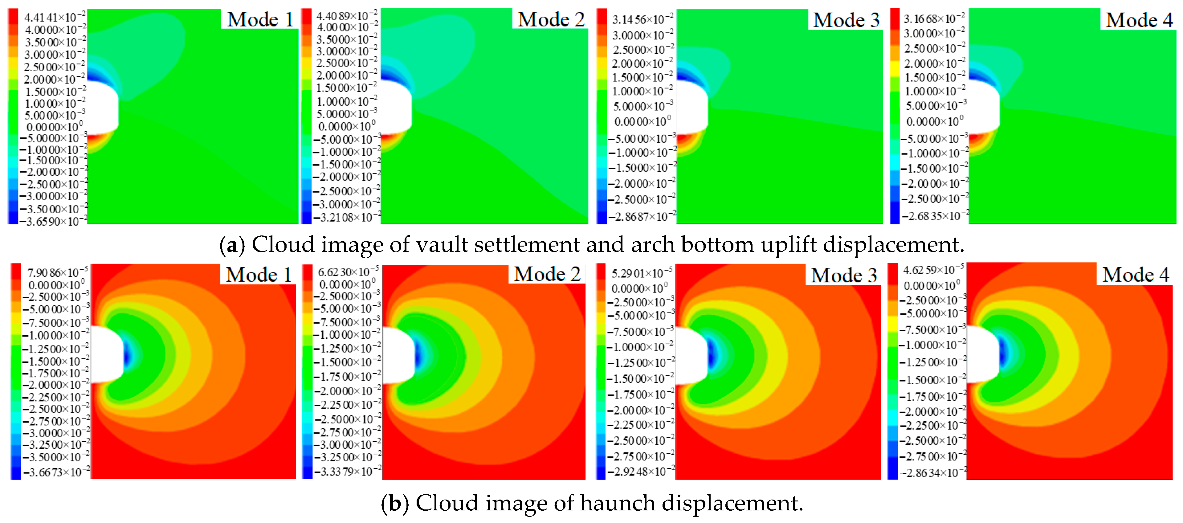 - The vault settlement, haunch convergence, and arch bottom uplift under different excavation methods of construction factors could be categorized into three phases: advanced deformation stage, excavation deformation stage, and deformation convergence stage, but the excavation methods are less sensitive to the surrounding rock displacement. The effect of the supporting mode on the displacement is limited. Support Mode 4 (shotcrete layer, anchor cables/bolts, and steel frames) provides excessive support strength. The optimal timing for initial support should be when the surrounding rock stress release ratio reaches 40–60%, as this approach both fully utilizes the self-bearing capacity of the rock mass and effectively controls harmful deformation.