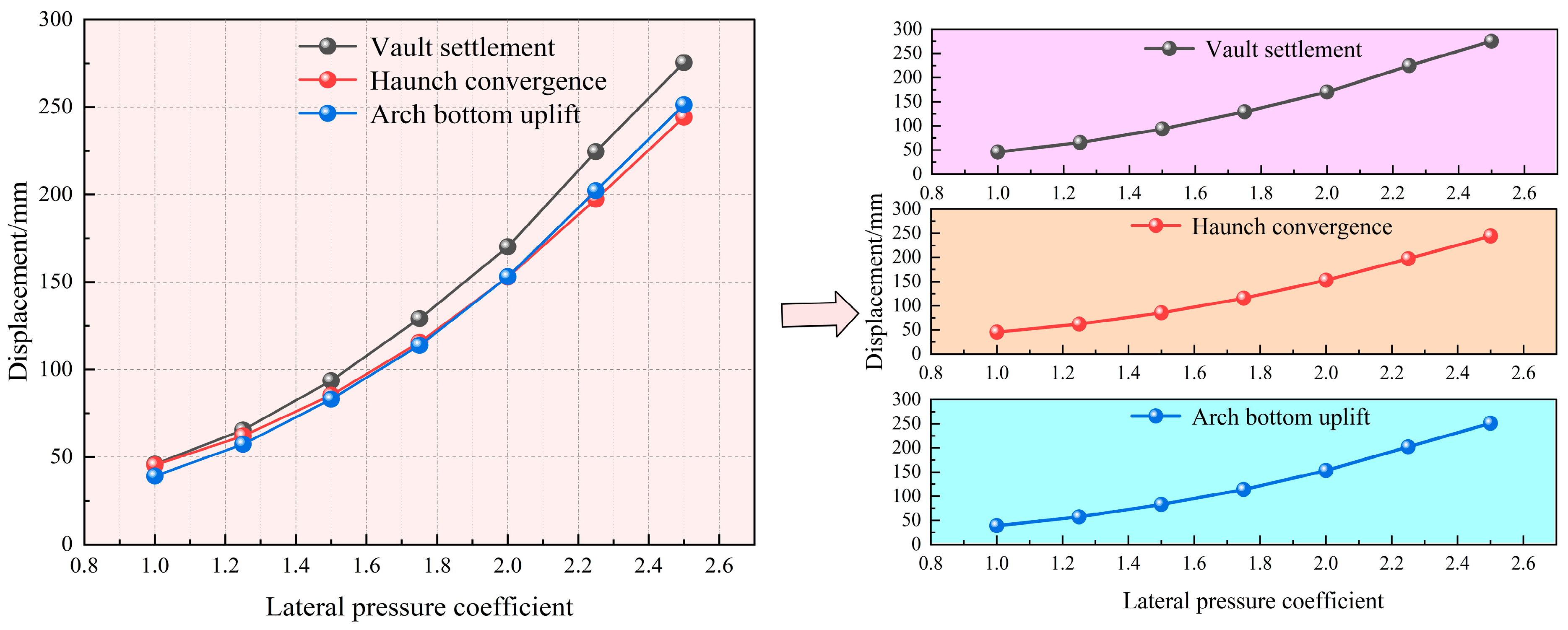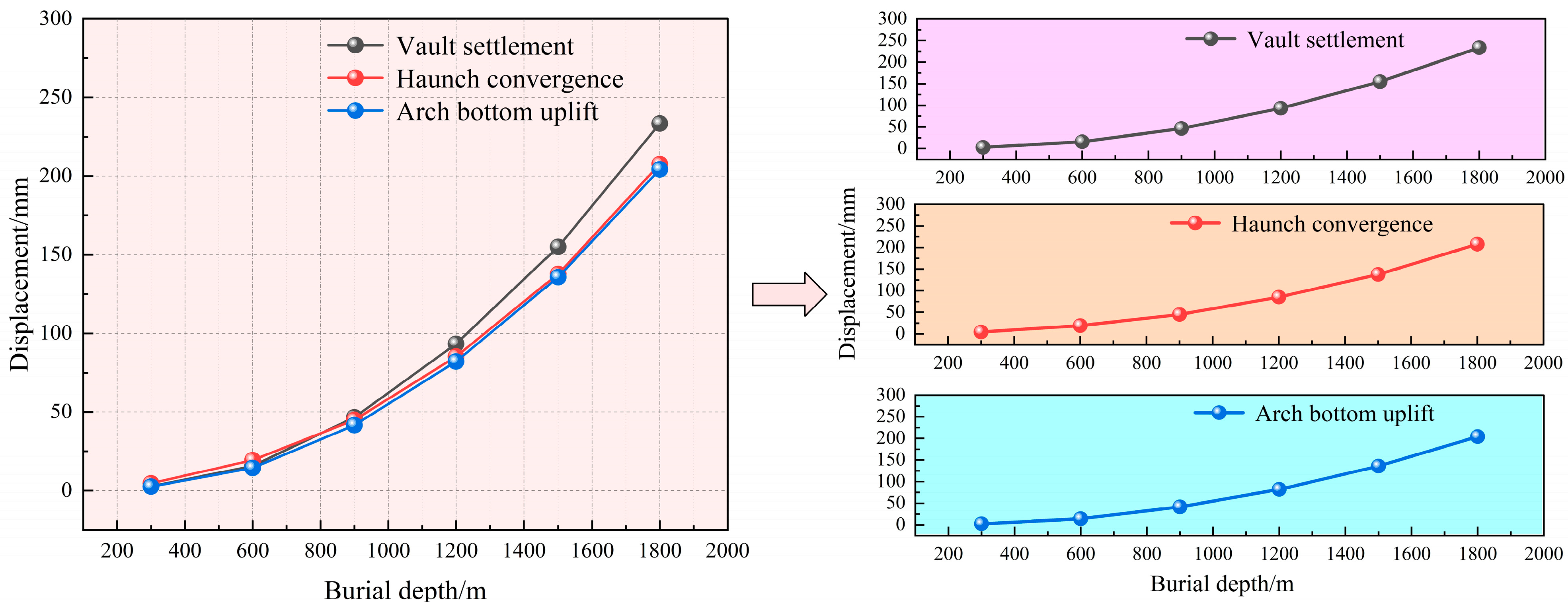 | Three-step method | Displacement values at the vault, arch bottom, and haunch consistently fall between those produced by the other two methods. | The displacement values of different parts are between the two methods. |