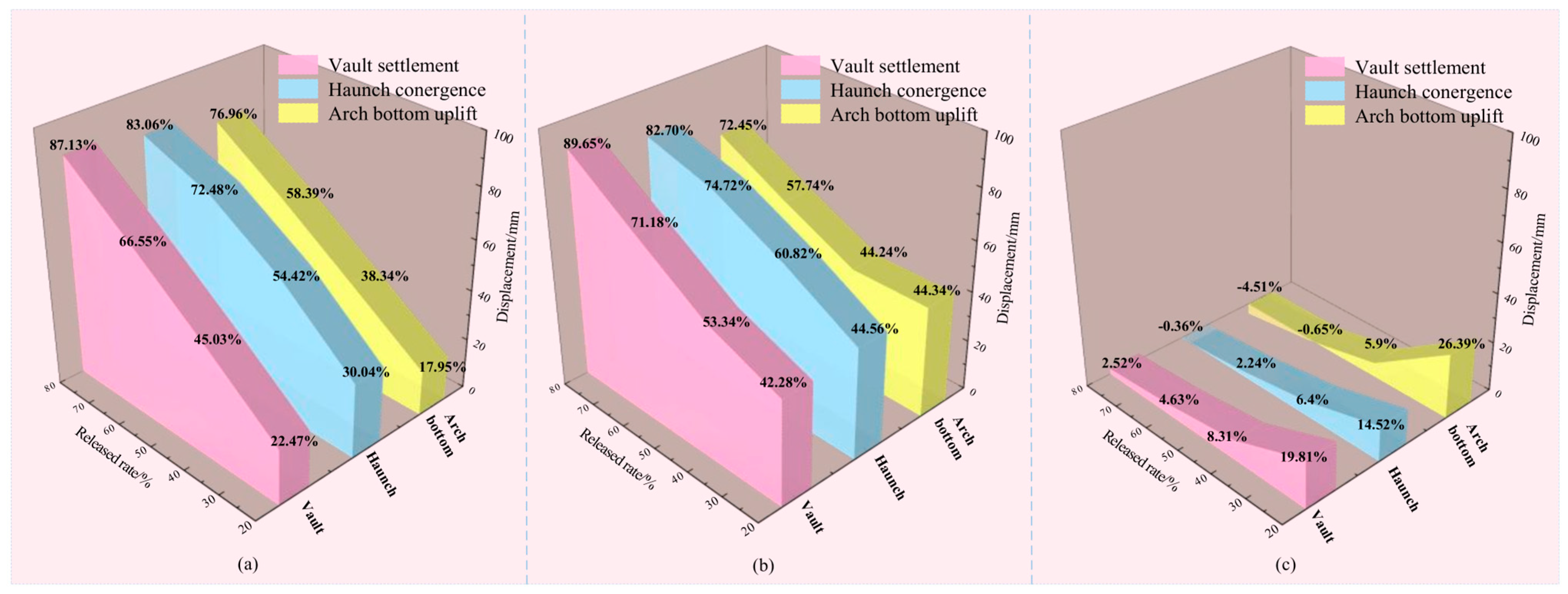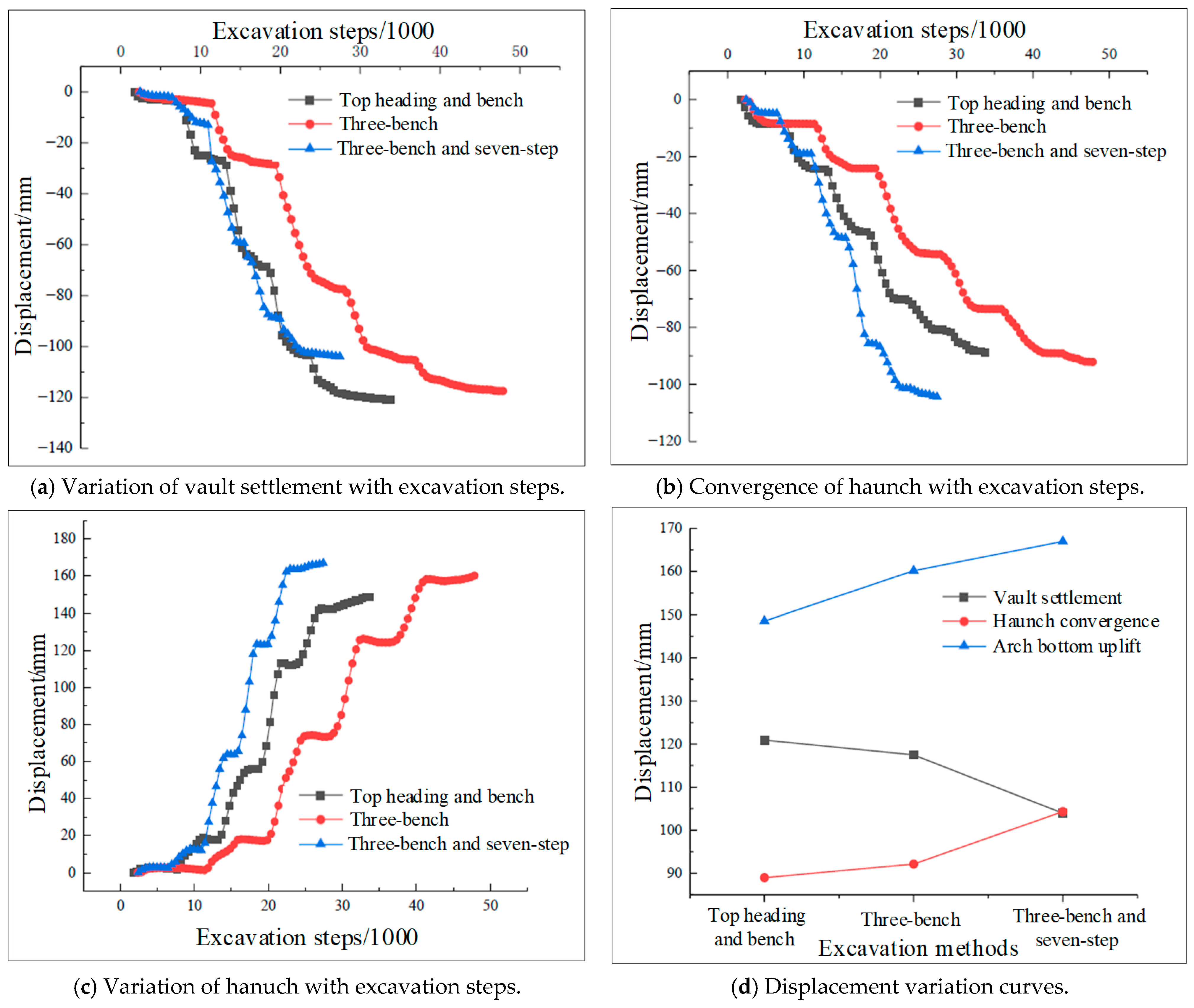 | Three-step seven-part method | Maximum displacements occur at both the haunch and arch bottom. | Haunch −104.32 Arch bottom −166.96 |