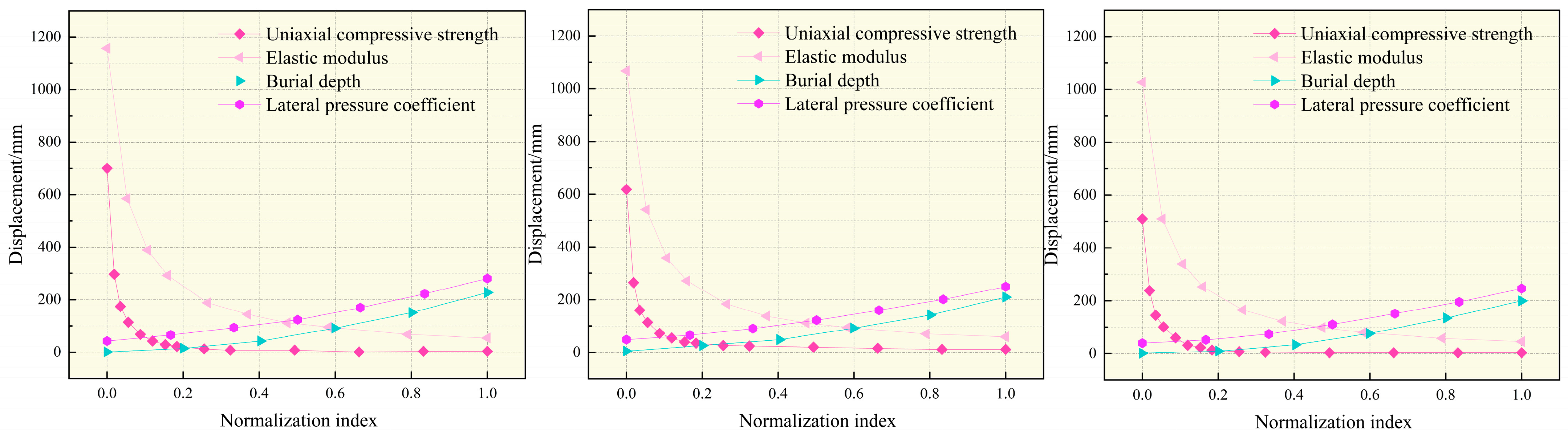 APA StyleLi, Y., Yu, Y., Li, L., Guo, J., & Qin, B. (2025). Influence Factors and Sensitivity Analysis on Material-Stress-Induced Large Deformation of Deep Underground Engineering in Soft Rockmass. Buildings, 15(21), 3887. https://doi.org/10.3390/buildings15213887