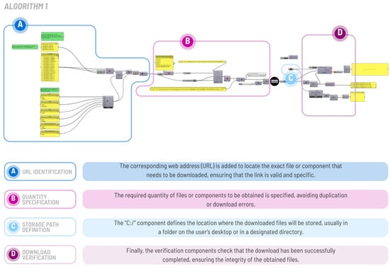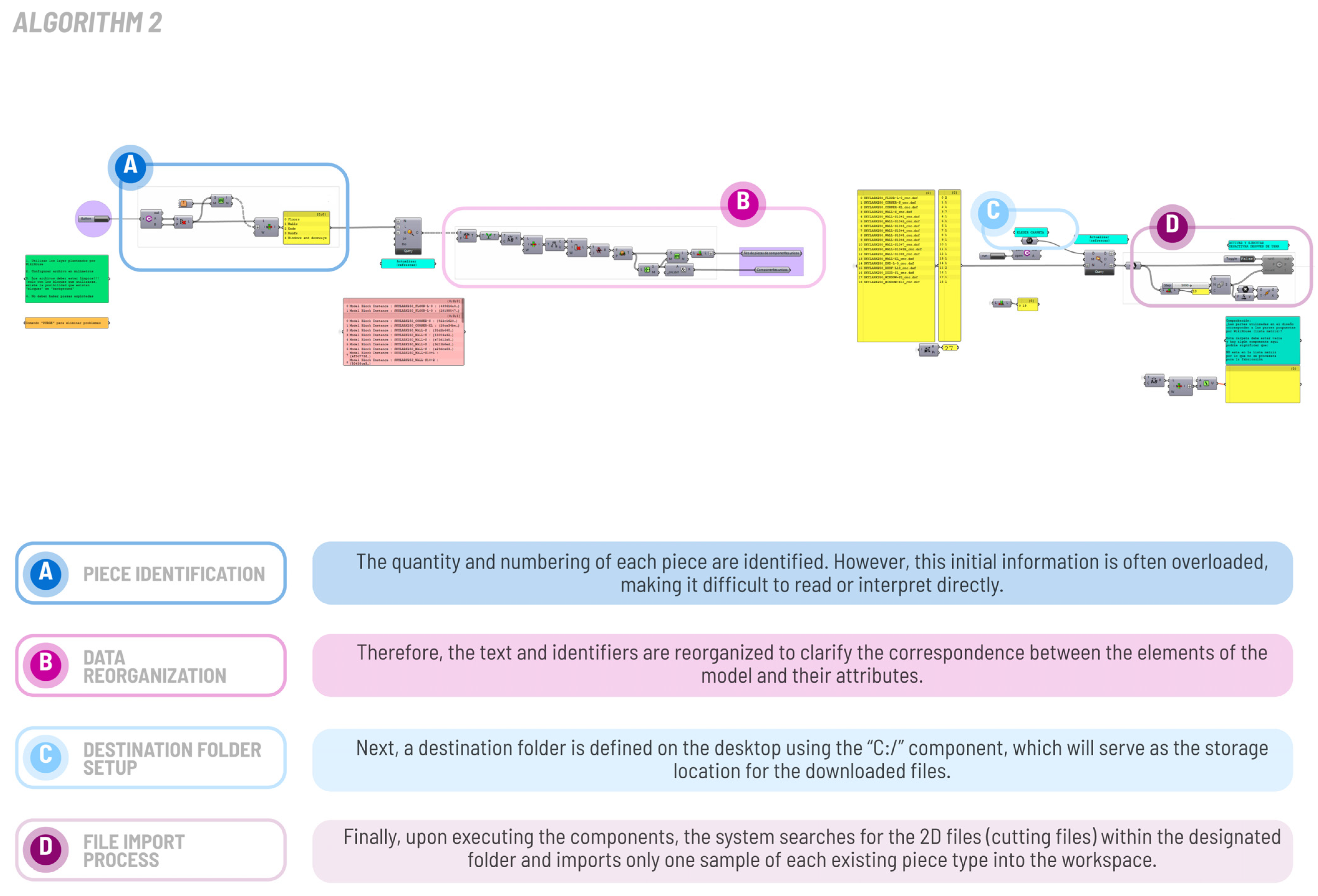 - Group A used a parametric algorithm developed in Grasshopper, composed of native components and custom Python scripts, aimed at automating the download of the 2D files corresponding to the WikiHouse parts. The system established a direct link between the nomenclature of each component and its respective address in the GitHub repository, simultaneously generating a default destination path on the desktop of each test subject. This configuration reduced manual intervention and minimized errors due to omission, while maintaining traceability between the digital model and the manufacturing files.
