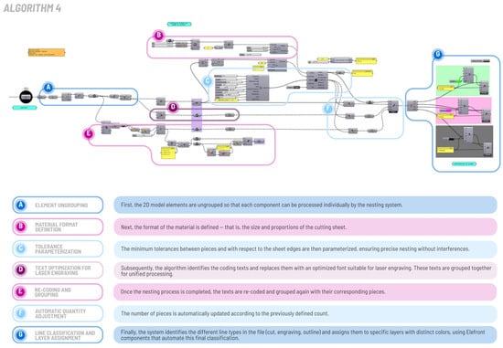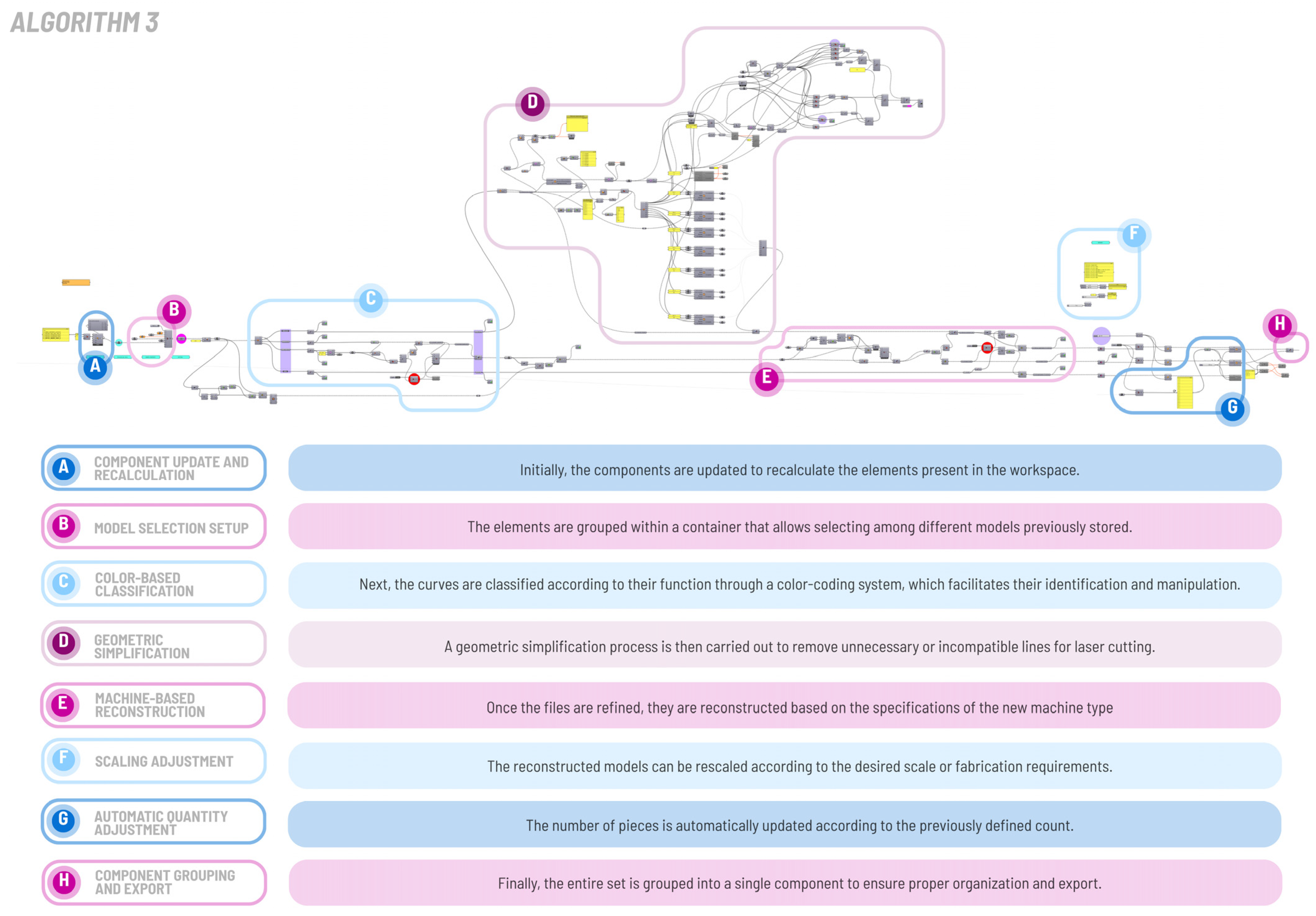 - Group A used the information derived from experiments 1 and 2, utilizing the exact parts list and their 2D geometries. These were imported into the three-dimensional environment of Rhino 8, where an algorithm with integrated scripts designed to automate geometric debugging and optimize cutting paths was applied. The procedure concluded with the generation of 2D files ready for manufacturing, with a clean format compatible with laser cutting systems.