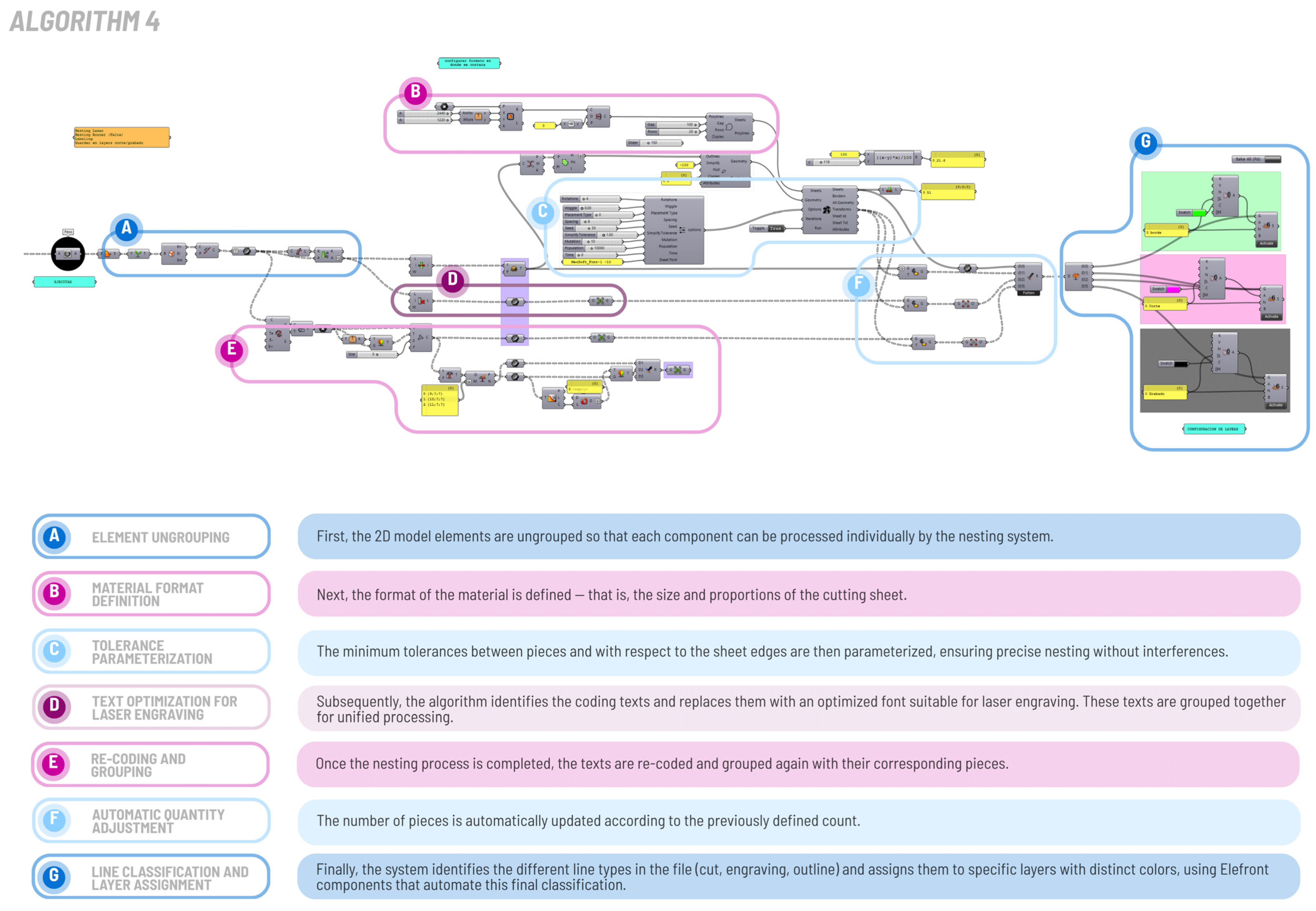 - Group A used the automated algorithm, which performed the nesting process comprehensively, considering both the number of parts and the spatial efficiency of the layout. The system rearranged, coded, and arranged the parts in Rhino, generating a file ready for the laser cutting process.