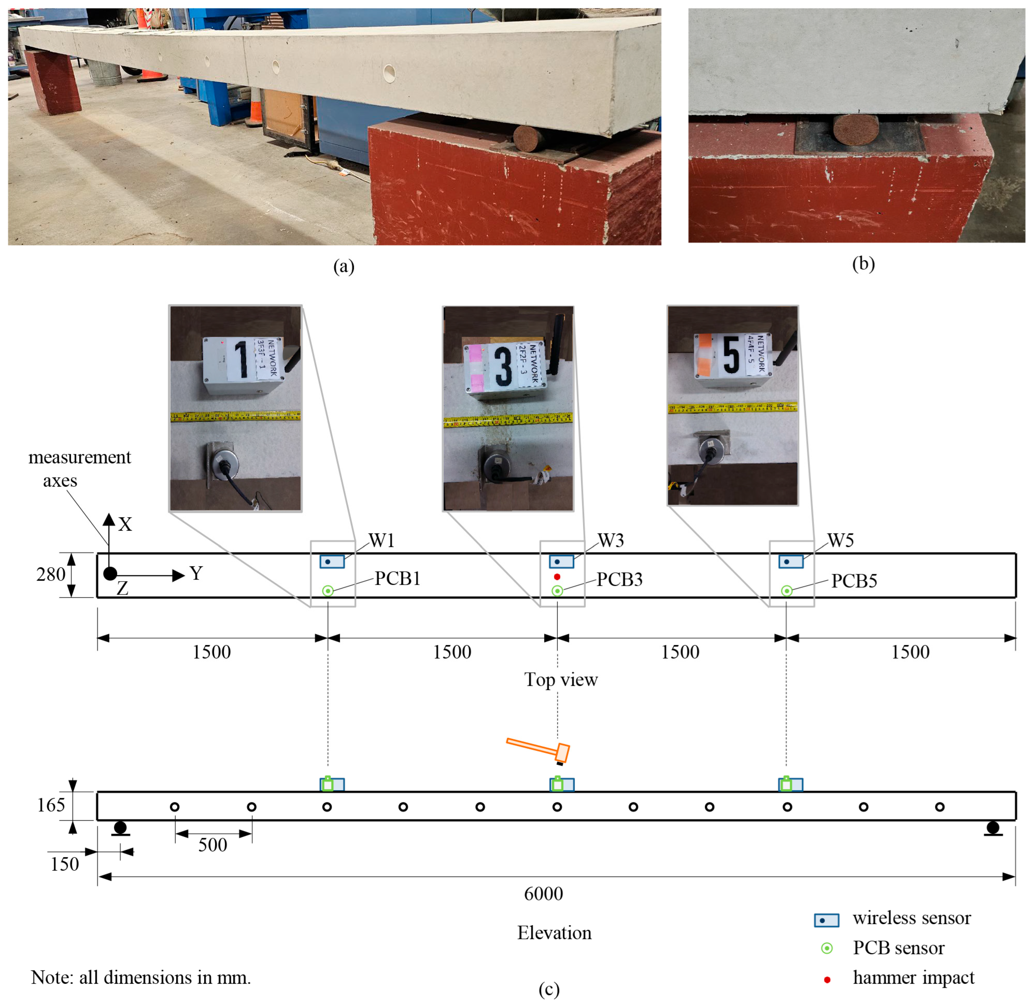 The ease of use and the performance characteristics of the proposed wireless technology have been validated through laboratory experiments carried out for the dynamic characterization of the simply supported reinforced concrete beam depicted in Figure 5a. In particular, the beam has a length of 6 m and a rectangular cross-section with a width and height of 280 mm and 165 mm, respectively. The end supports consist of roller supports placed at 150 mm from the beam ends, as shown in Figure 5b.