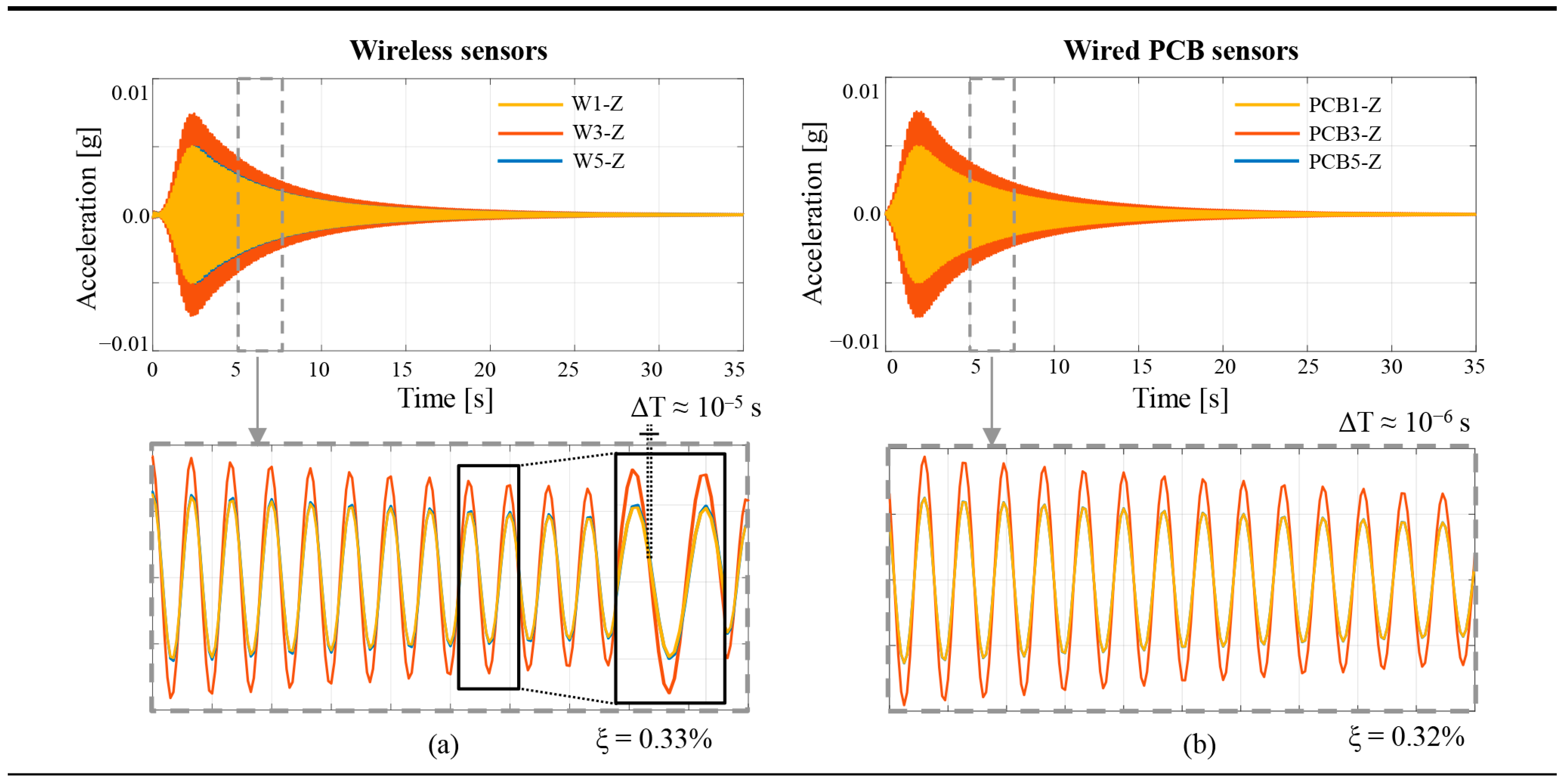 where ui is the amplitude of the acceleration at the i-th cycle. The damping ratios estimated based on the signals recorded with the wireless and wired sensors are nearly identical, i.e., 0.33% evaluated with the wireless sensors vs. 0.32% with the wired PCB sensors.