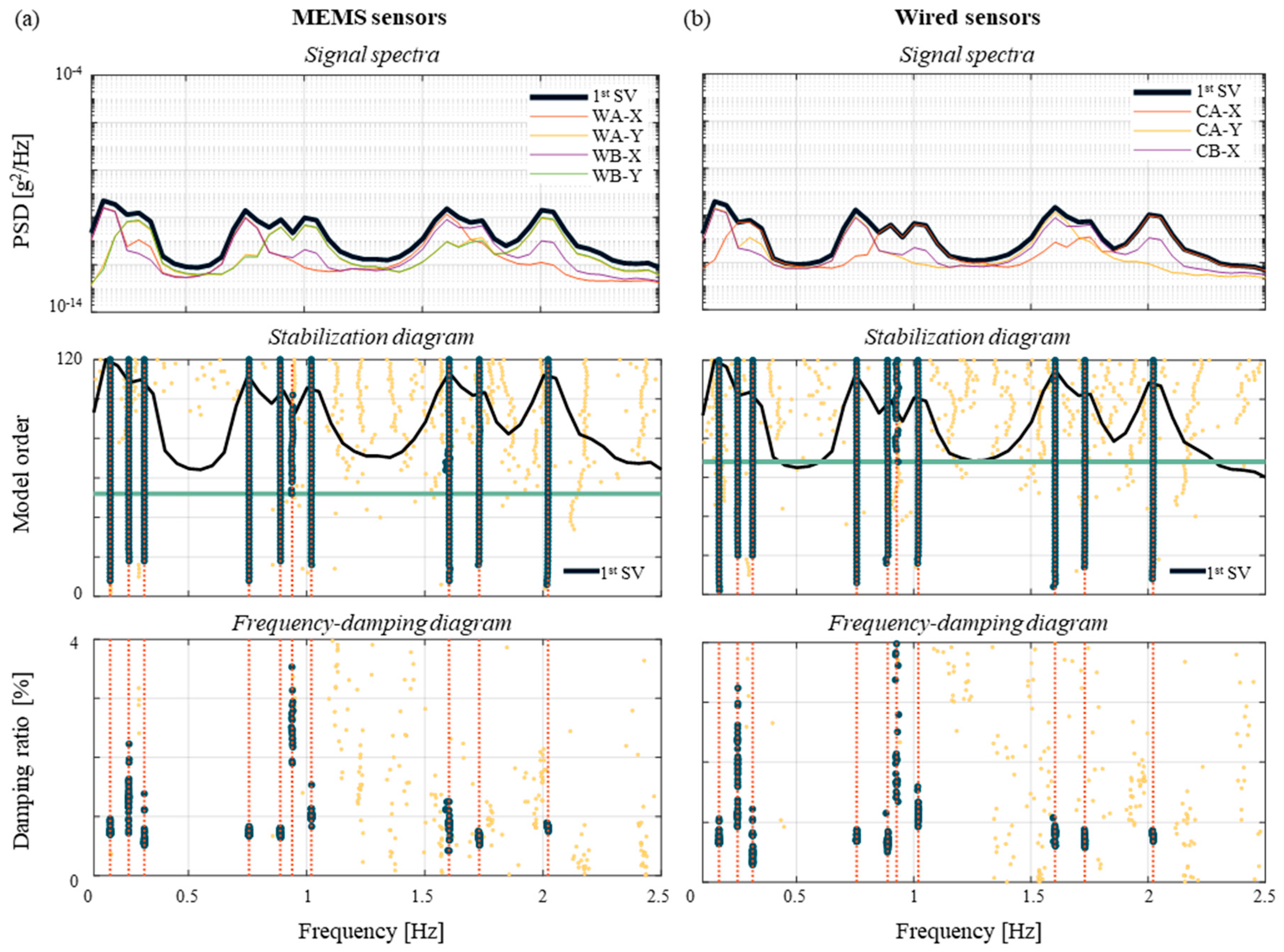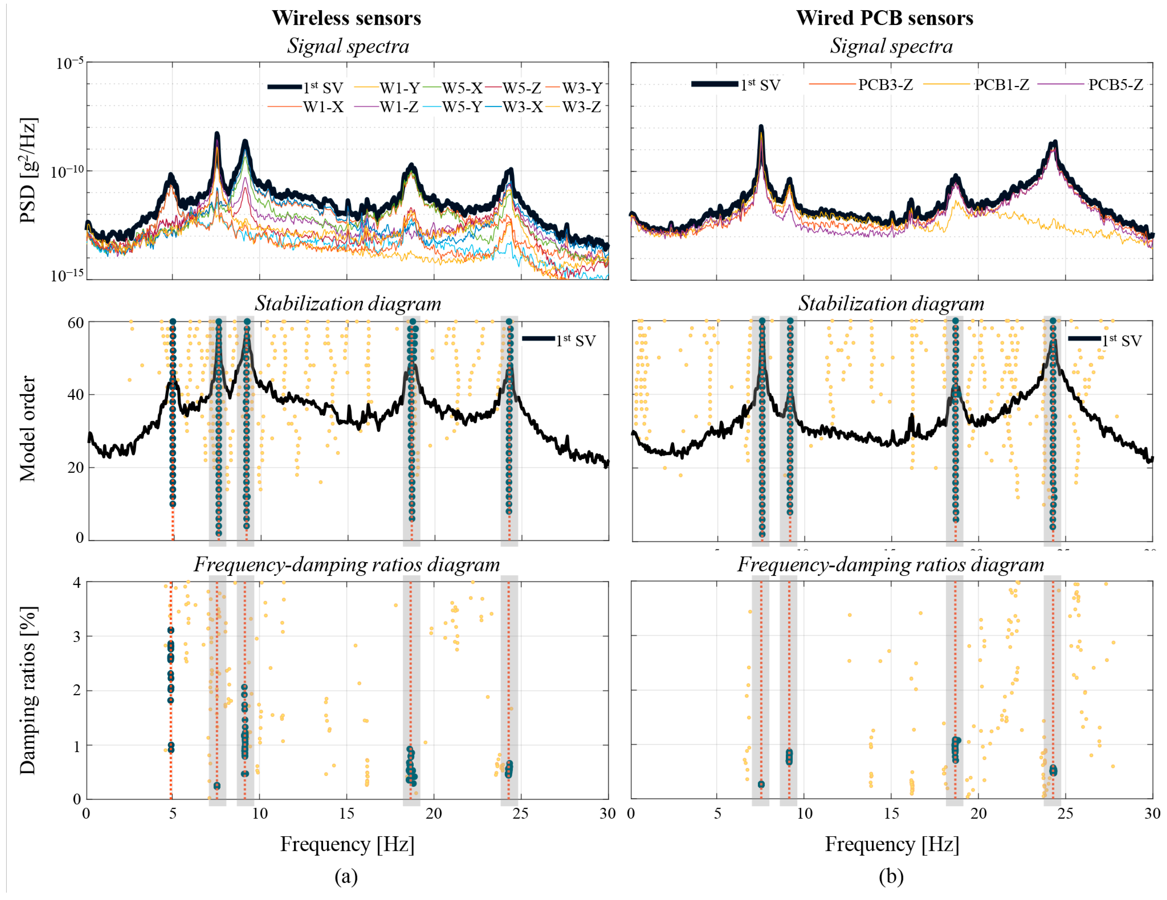 Figure 12. Results of the modal identification for test T2: (a) Wireless sensors and (b) wired PCB sensors.