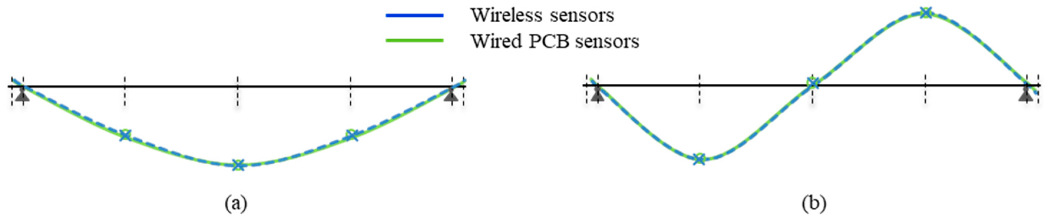 The validation process involved comparing the dynamic measurements obtained with the proposed wireless sensors to those recorded by wired monoaxial piezoelectric accelerometers (PCB model 393B31). These wired sensors have high sensitivity (10 V/g), a frequency range of 0.1–200 Hz, and low spectral noise (0.06 µg/√Hz at 1 Hz and 0.01 µg/√Hz at 10 Hz) [91]. Across all tests, the wireless system produced results comparable to those from the wired sensors, further confirming the excellent synchronization of the wireless technology that is required when performing dynamic structural characterizations.