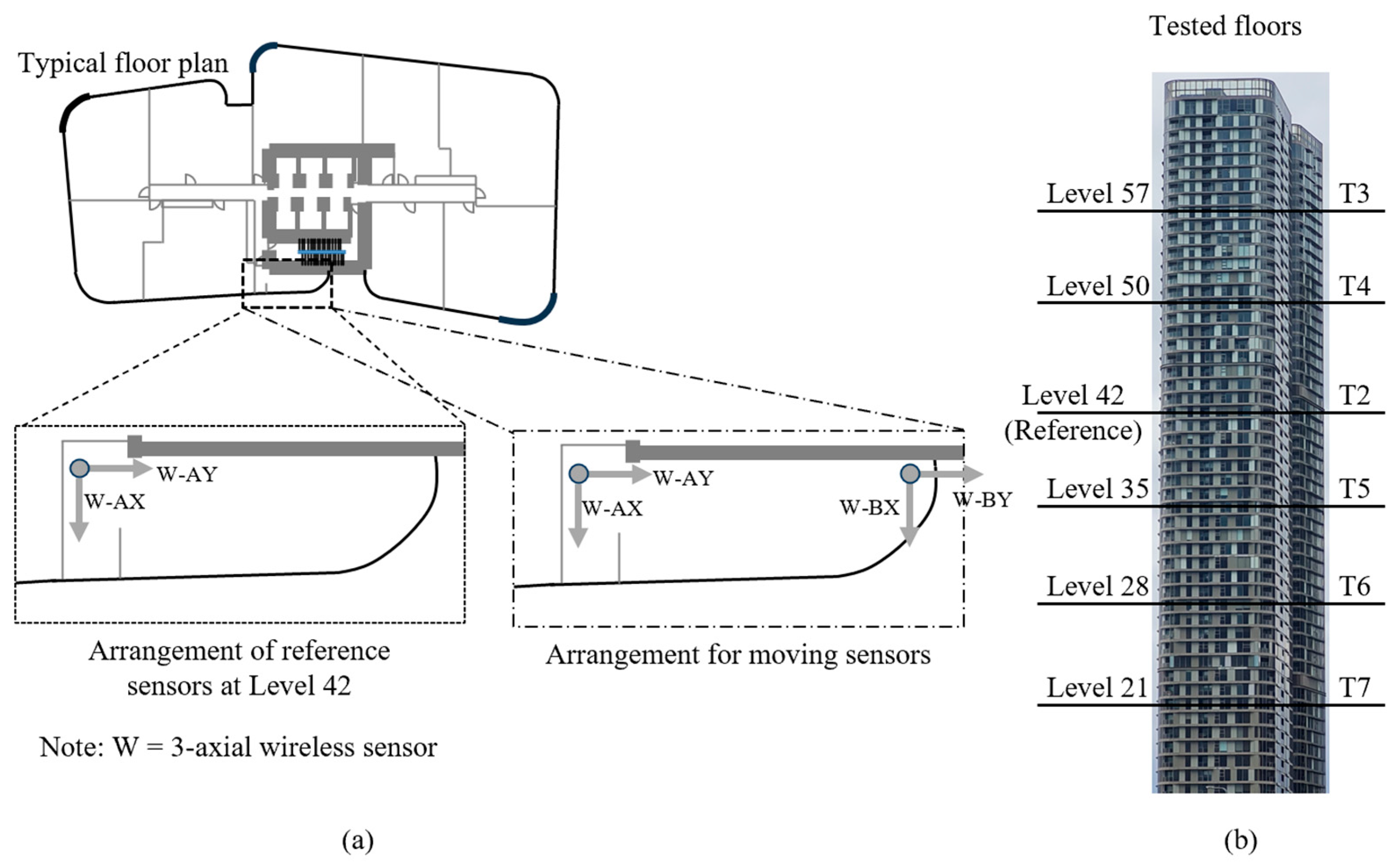 The proposed wireless technology is suitable for deployment in civil engineering structures, and because of this, it is important to verify its performance in a real structural system. For the purpose of this study, a newly constructed 67-story building in Parramatta, Australia, has been considered and whose location is representative of a typical urban scenario of a typical Australian city. The ambient conditions present during the validation tests are representative of days in which no extreme weather conditions were present. An overview of the building is shown in Figure 9a, and a typical floor layout is presented in Figure 9b.